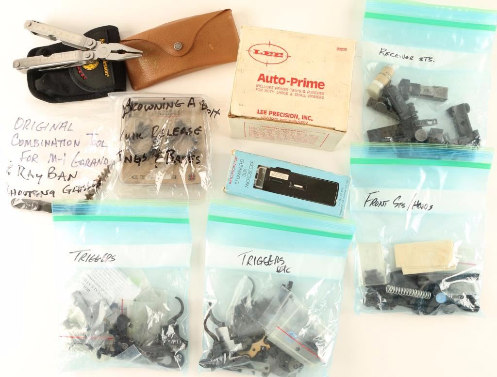 Includes a 30X Microscope, original combination tool for a M1 Garand, a pair of Ray Ban shooting glasses, a S&W tool set, a Browning A-Bolt quick release rings and base set, receiver sights, front sights, misc. triggers, and a Lee Auto-Crime Kit.