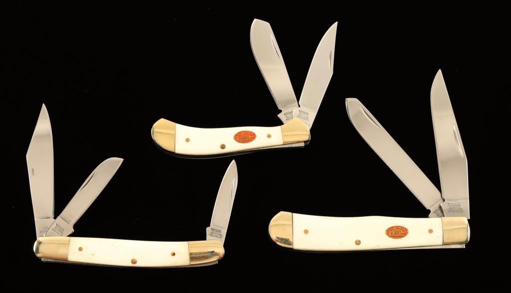 Includes a 'Trapper', a 'Wrangler', and a 'Small Saddlehorn' multi-blade pocket knives.