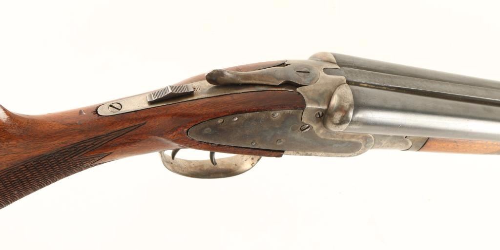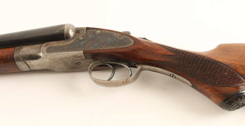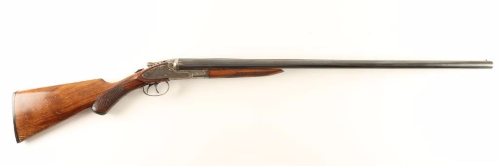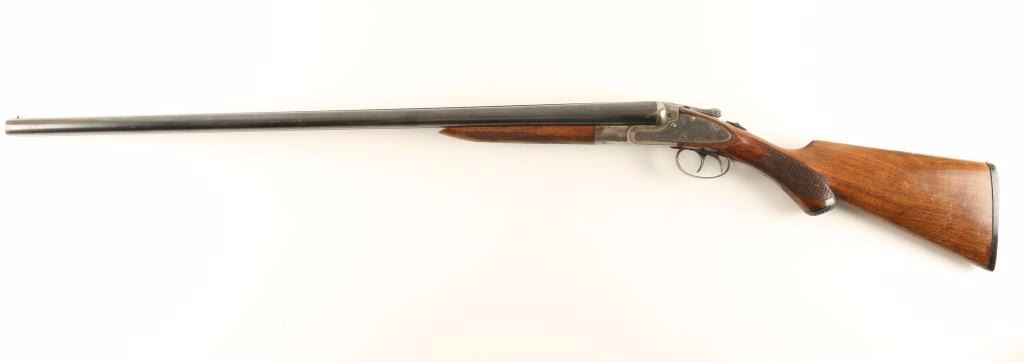 Trade name double barrel sidelock shotgun chambered for 12 gauge shells. Featured a blued & case hardened finish, 29 3/4" barrels with solid top rib, bead front sight, checkered top lever, double triggers, sliding tang safety, checkered walnut forend and pistol grip shoulder stock with black hard rubber buttplate. Shotgun exhibits approximately 70% of it's original finish showing moderate wear and handling marks. Action is crisp, bores are excellent and wood stocks are good showing a crack below the right side lock. Condition is good+. ***Modern Firearm***