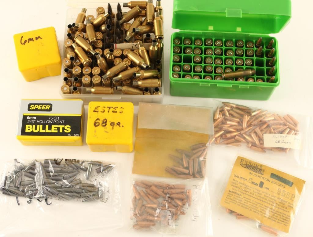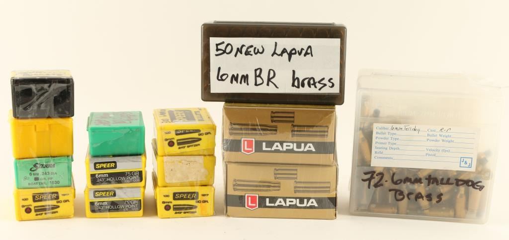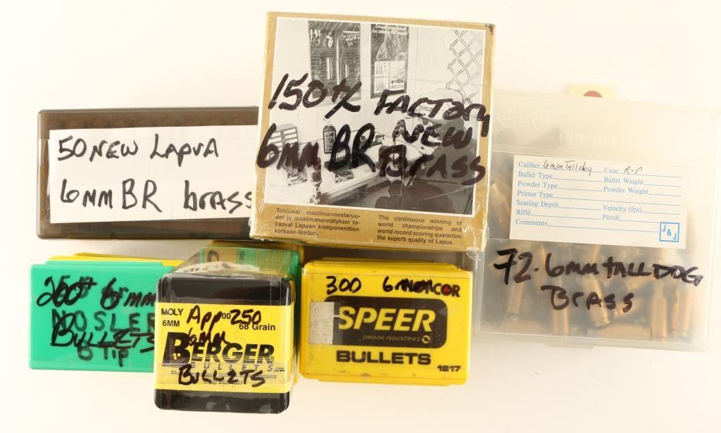 Including approximately 162 rds of 6mm tall dog brass, 200 +/- rds of new Lapua brass, 48 rds of 6mm TCU, and approx. 900 6mm bullets by various makers.