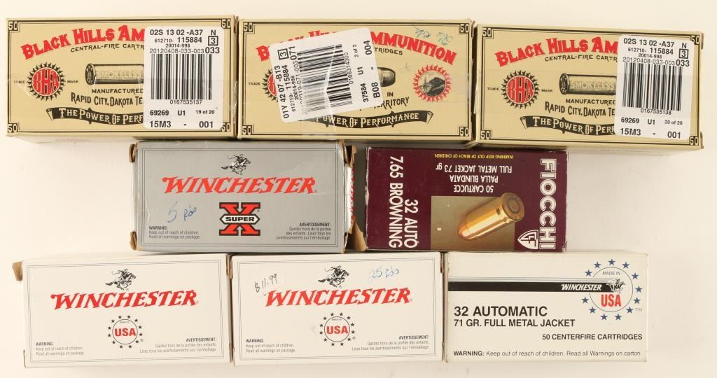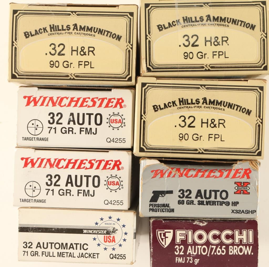 Including 126 rds of Black Hills .32 H&R 90 Gr. FPL, 125 rds of Win. .32 Auto 71 Gr. FMJ, 5 rds of Win. .32 Auto 60 Gr. Silvertip HP, and 50 rds of Fiocchi .32 Auto/7.65 Brow. 73 Gr. FMJ