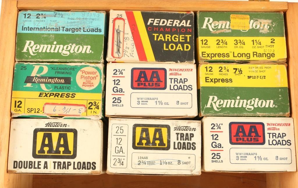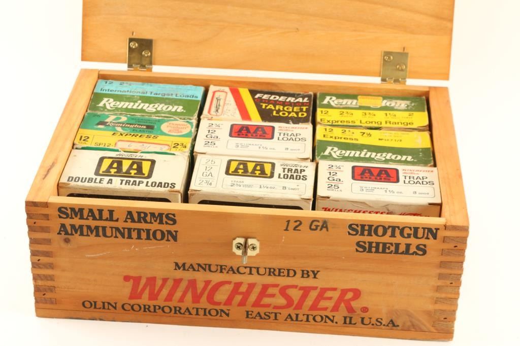 Includes approximately 200 rds of 12 Ga Shotgun ammo in a wooden Winchester ammo box.