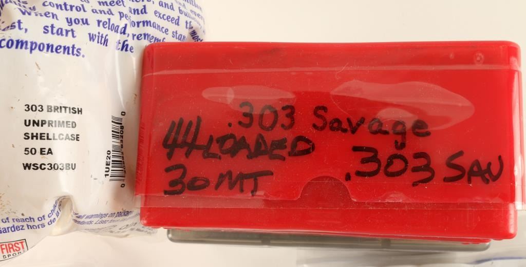 Including 200 rds Britsh brass unprimed in original bags, 44 reloaded cartridges and 30 empty cartridges