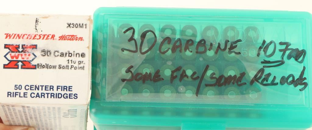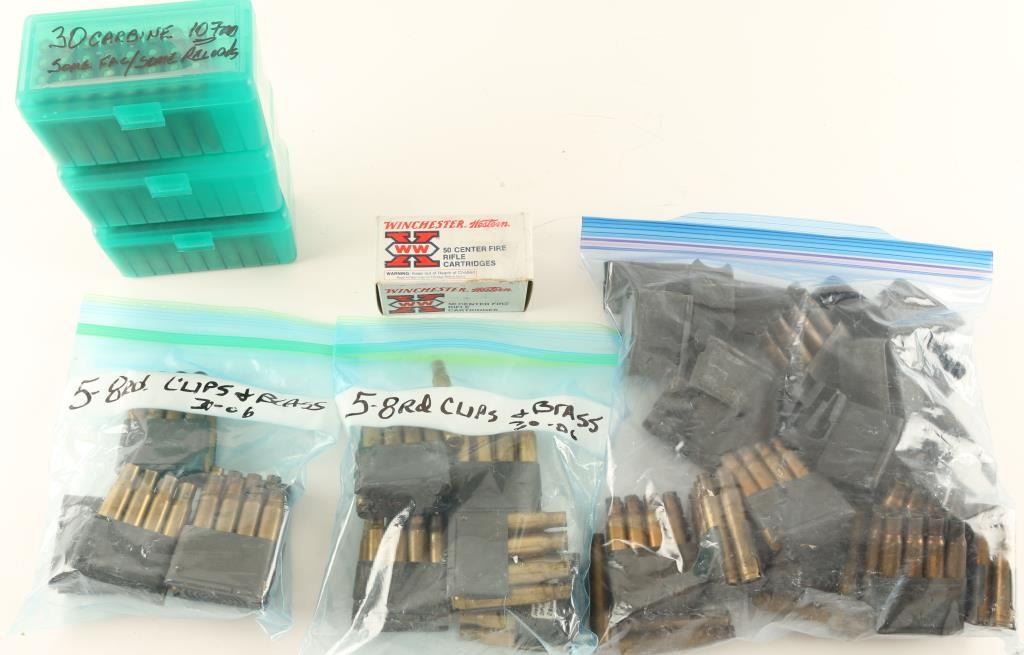 Including eighteen 30-06 8 rd clips & brass, 50 new WIN 30 carbine cartridges, and 107 rds of 30 carbine new and reloads by various makers.