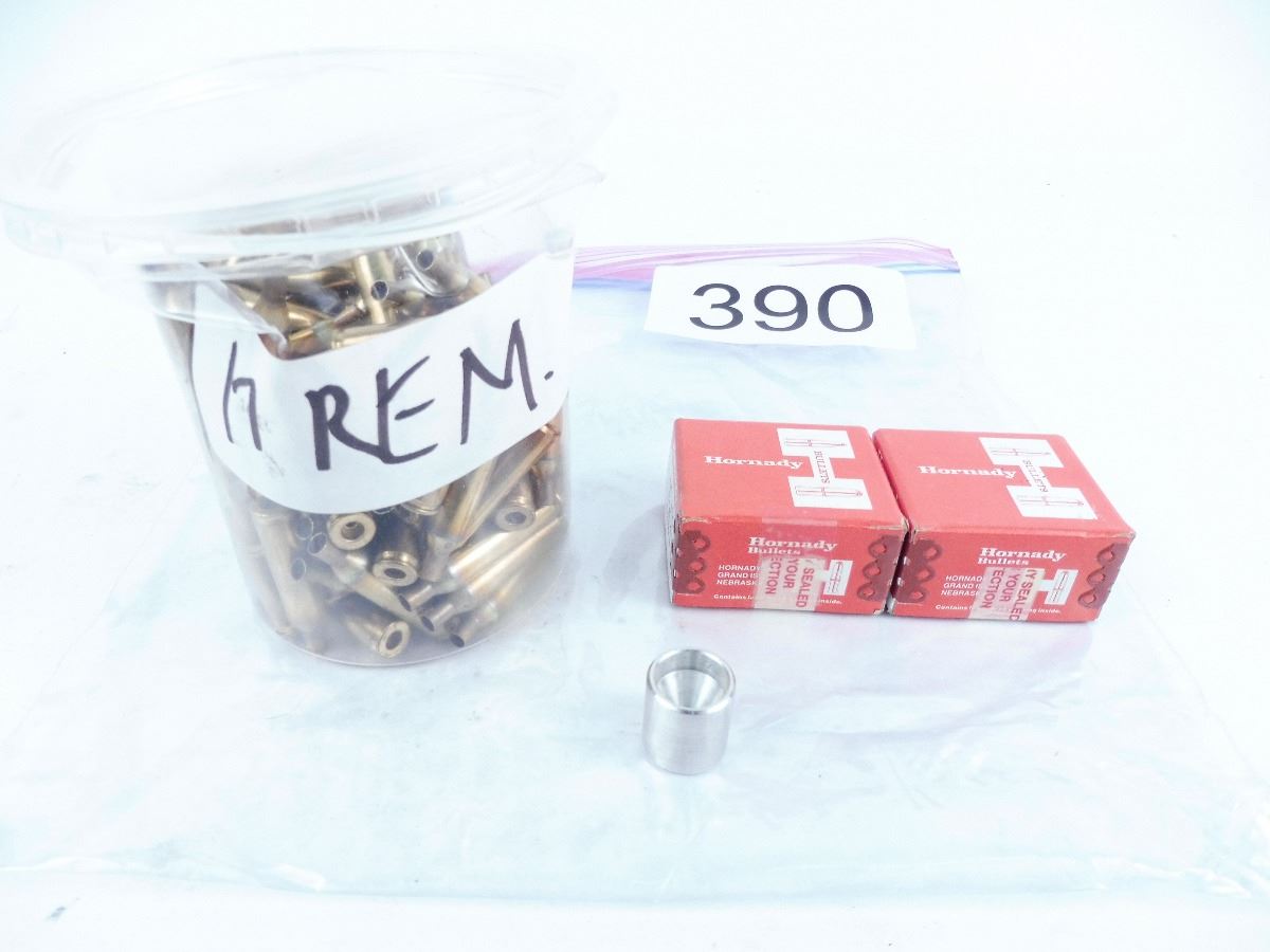 Lot 390 Container New 17 Remington brass with bullets and powder funnel adapter