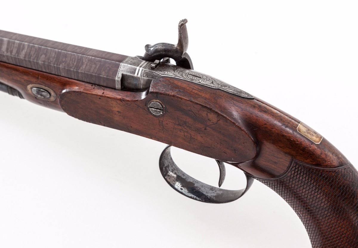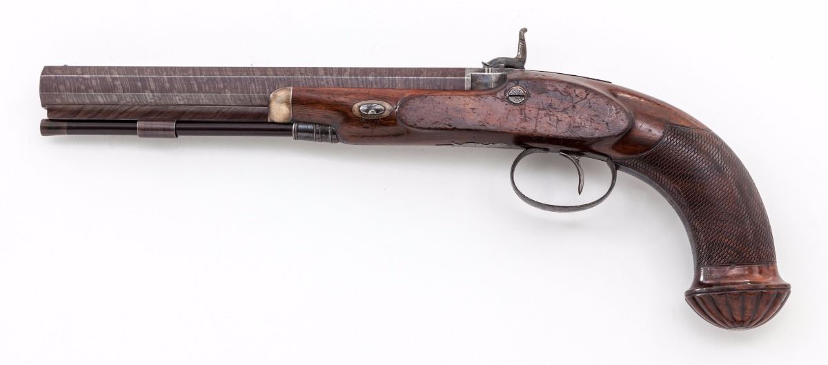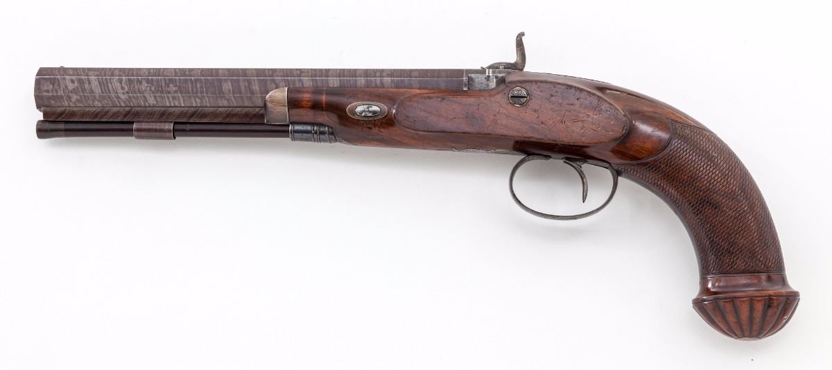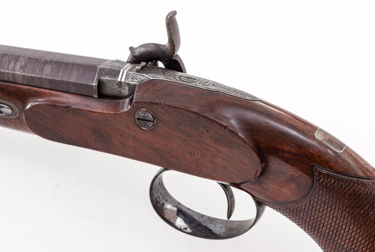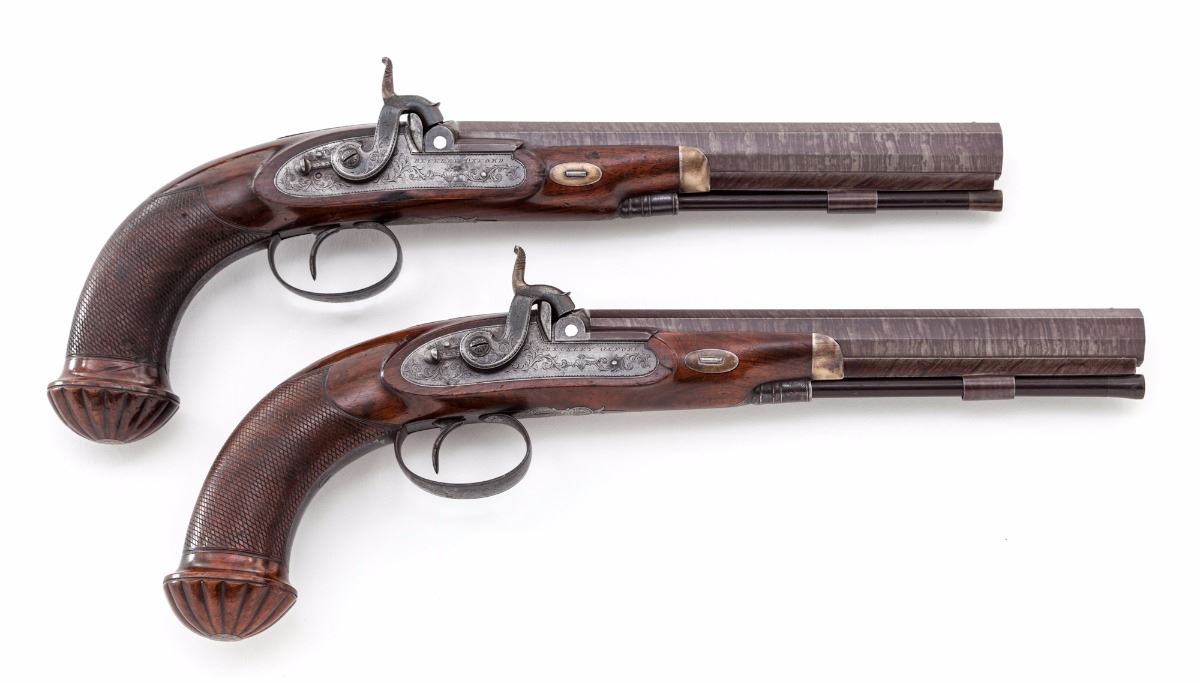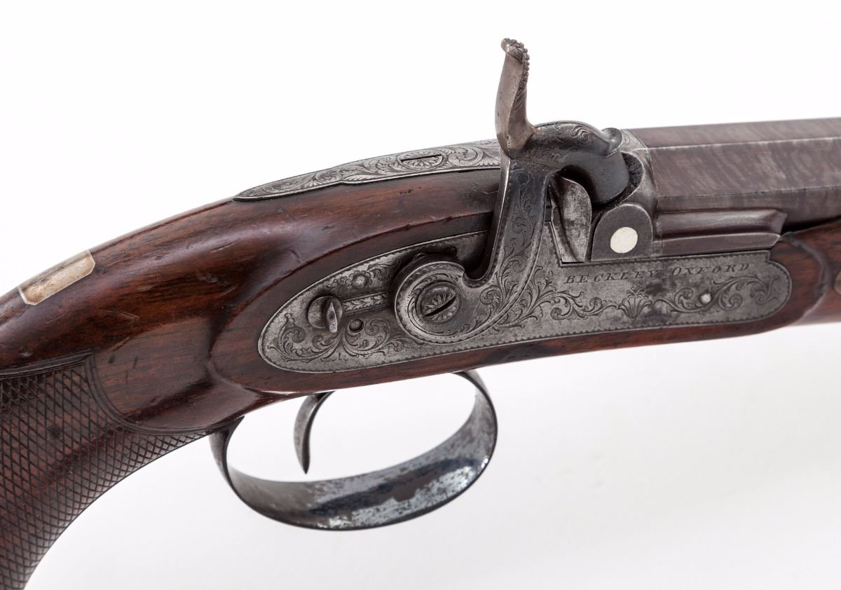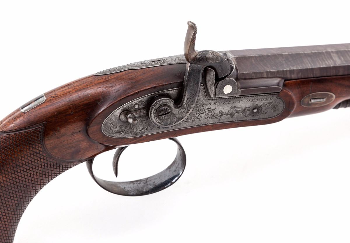Very Fine Pair of Provincial English Percussion Target Pistols, by Beckley of Oxford, each pistol having a browned 8-1/2'' octagonal twist barrel of .54'' bore with 13-groove rifling, small notched rear sight and front silver bead, double platinum breech bands and platinum plug. The locks are case colored and engraved with subtle triangle bordered floral and vine patterns which follow to the upper tangs, polished blue triggerguards and ''KA'' initialed finials; hammers are early percussion period stylized dolphins with half-cock notches and sliding safety latches. The lacquered English walnut stocks have medium figure grain patterns with contoured silver nose caps and barrel wedge plates; grips have finely executed and proportioned flat diamond bordered checkering with rose engraved silver bases inlaid in the scalloped grip caps; upper wrists have very small vacant rectangular silver initial shields; ramrod tail pipes have a polished blue finish matching the triggerguards and lower tangs; ramrods are ebony with brass tips and ferrules (Note: Ramrods appear to be by the same maker with one being fractionally longer than the other and having a slightly different tip and ferrule style). Pistols weigh in the range of 31-32 ozs. each. Overall condition of the pair is very fine, appearing generally well maintained over time. Mainsprings are strong, muzzles are sharp; bores have distinct rifling with brown oxidation; locks have a cleaned silver patina with traces of color on the hammers. Blued finishes remain 50% with light oxidation. Stock lacquer covers earlier scratches, powder marks and dents, wedge plates have hammer marks, and a small section of the stock is chipped from one pistol in front of the lockplate. Est.: $2,200-$2,800/pair. (Antique)