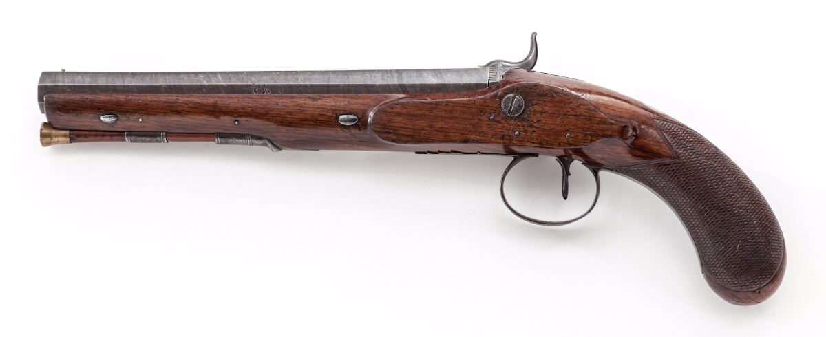 Fine English Single Shot Percussion Pistol, by I. Field, .65 cal., 9'' octagonal barrel, checkered full-length stock of European walnut, lightly engraved hammer, tang and sideplate, with hammer lock and platina inlay to nipple bolster. Condition is excellent. Barrel retains much of its original fluid steel colors with one small area of light pitting to right side barrel flat. Hammer and lockplate have gone bright. Triggerguard retains approx. 60%+ blue with strong details to finial; Stand of Arms is crisp. Stock with light scuffs and minor pressure dings, mostly visible to right sideplate screw. Brass bell-tipped ramrod appears original with worm at opposite end. Good action, fine bore. Est.: $1,000-$1,500. (Antique)