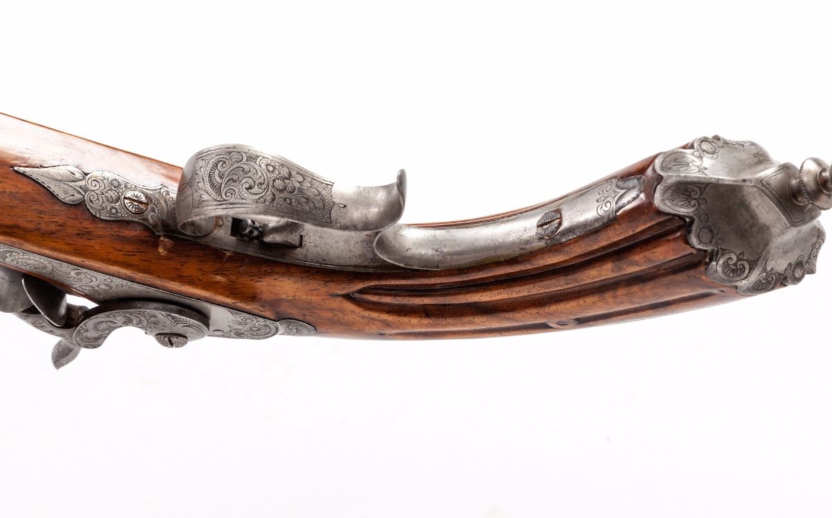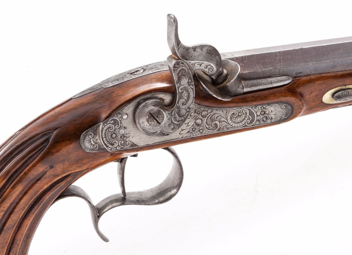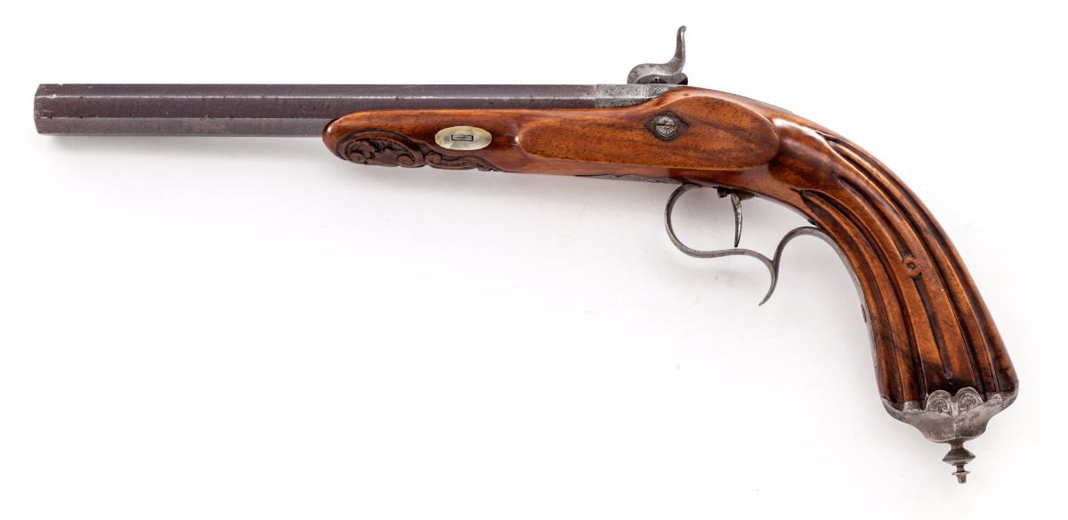 Belgian Single Shot Percussion Target Pistol, NVSN, approx. .50 cal., 9'' octagonal barrel, fluted walnut stock, finely engraved lockplate, hammer, upper tang, triggerguard and pommel cap. Condition is fine as partially refinished. Barrel retains approx. 80% original factory blue/brown, missing front sight blade. Stock has been lightly refinished and shows well. Good functioning action, very good bore. Est.: $500-$750. (Antique)