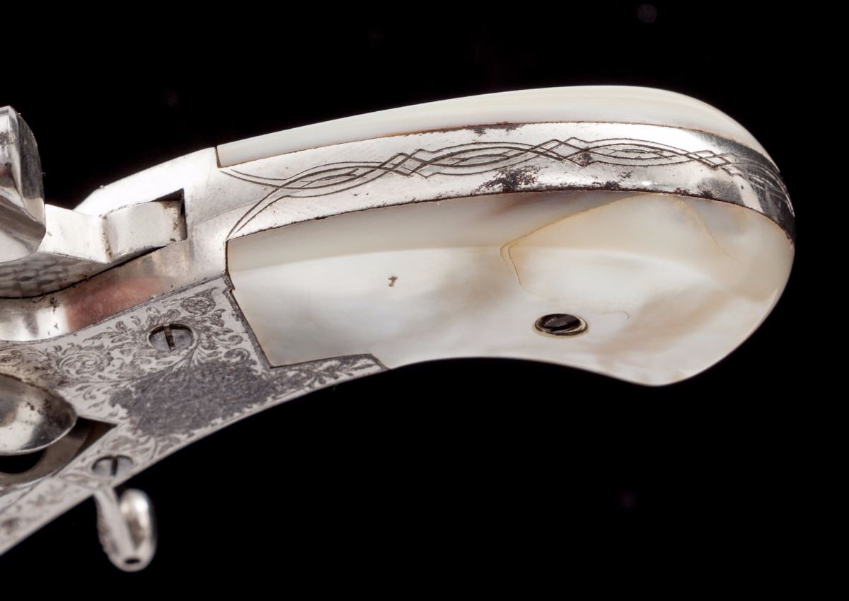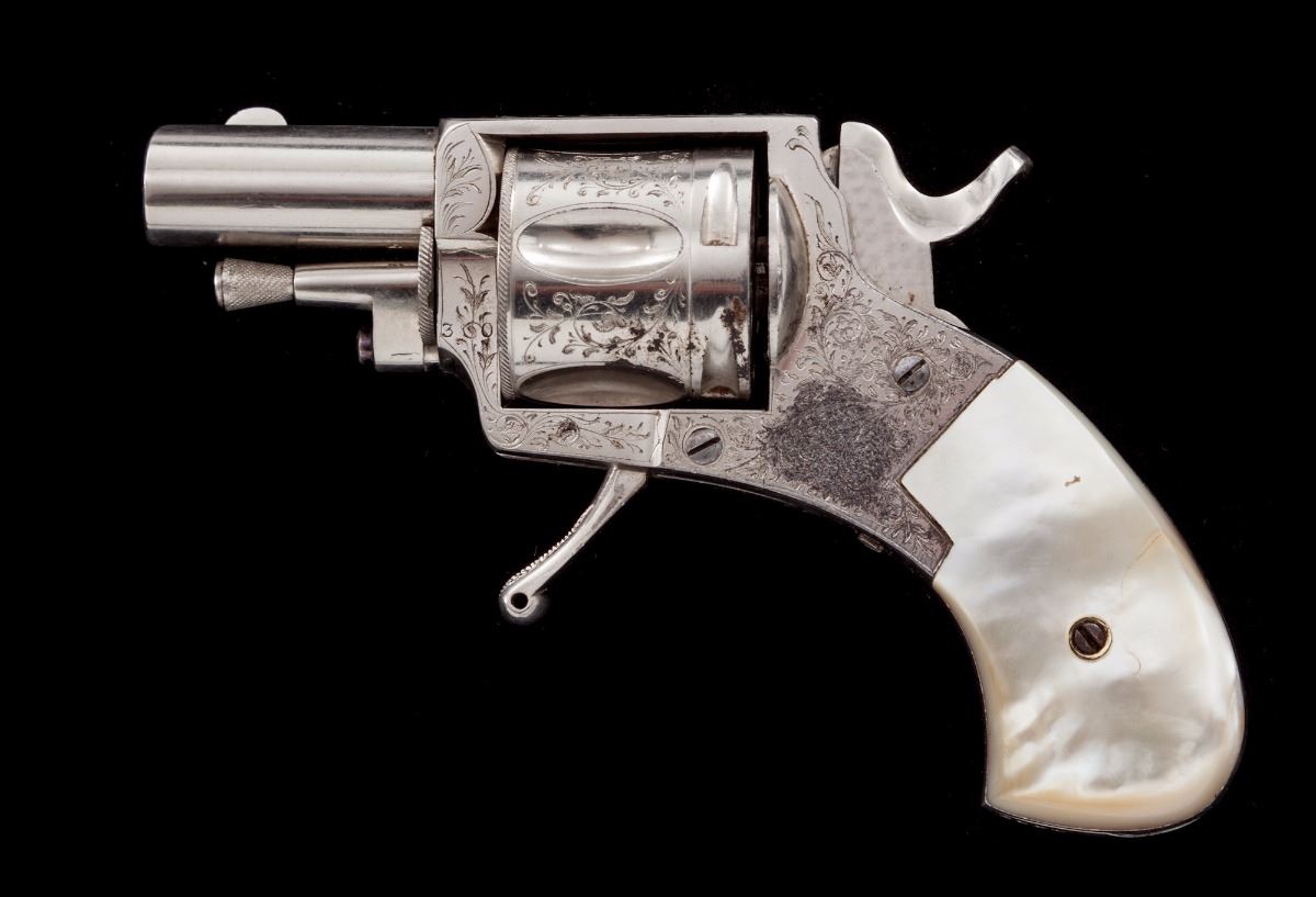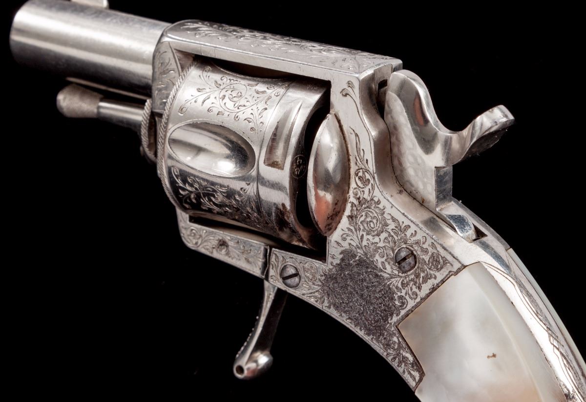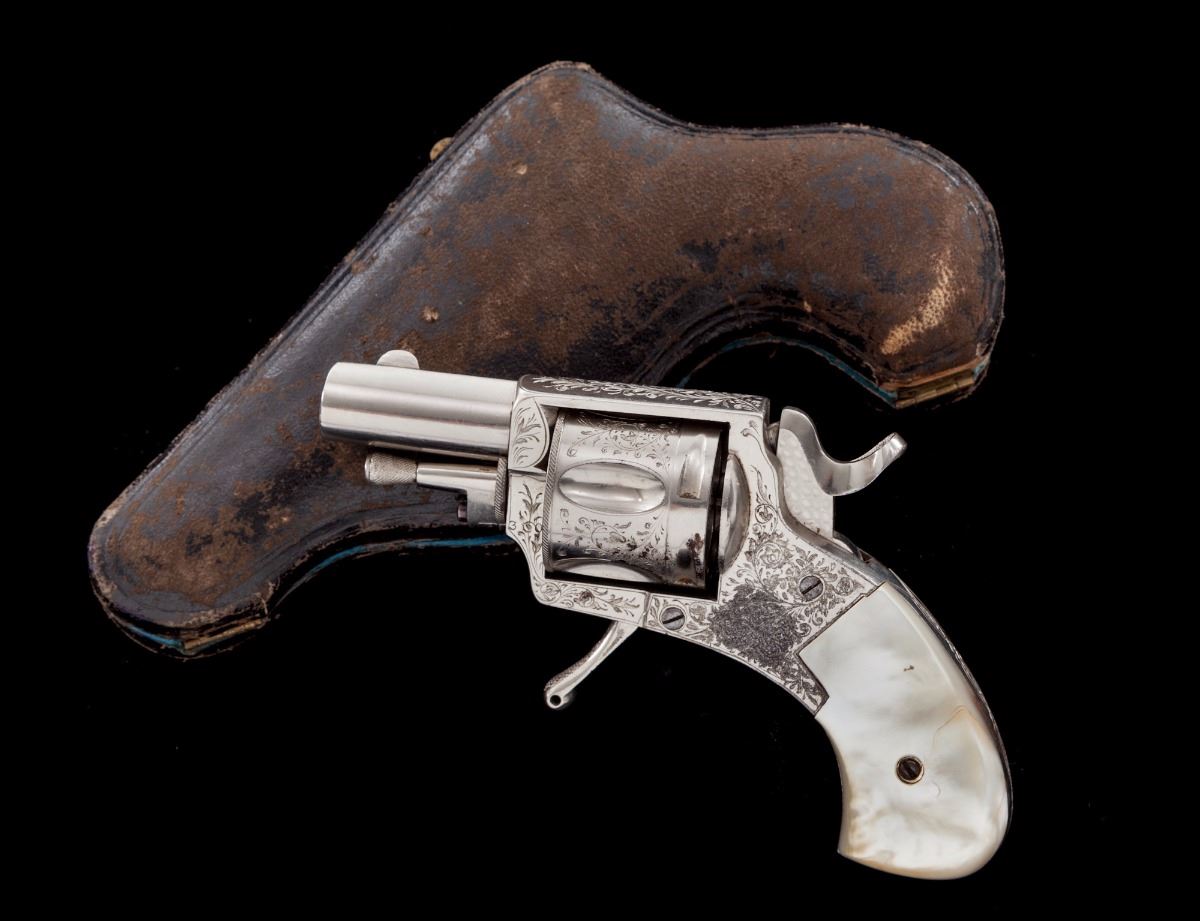 Antique Floral Spray Engraved Belgian Folding Trigger Double Action Revolver, in original pipe casing, #4309, .38 Short cal., 1-1/2'' barrel, finely engraved cylinder, frame and top of barrel; nickel plated, with mother of pearl slab type grips. Condition is excellent with small fingerprint size area of finish loss to left side of frame just behind trigger. Grips with small fissures to left panel and excellent iridescence. Action is fine, bore is bright. Moroccan leather pipe case shows moderate scuffs to exterior; blue velvet and satin interior shows some oil transfer and thinning near cylinder area. Est.: $1,200-$1,800. (Antique)