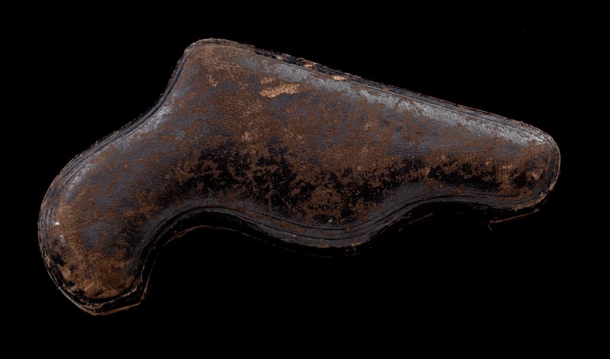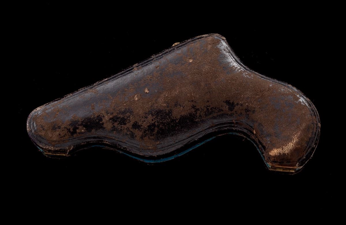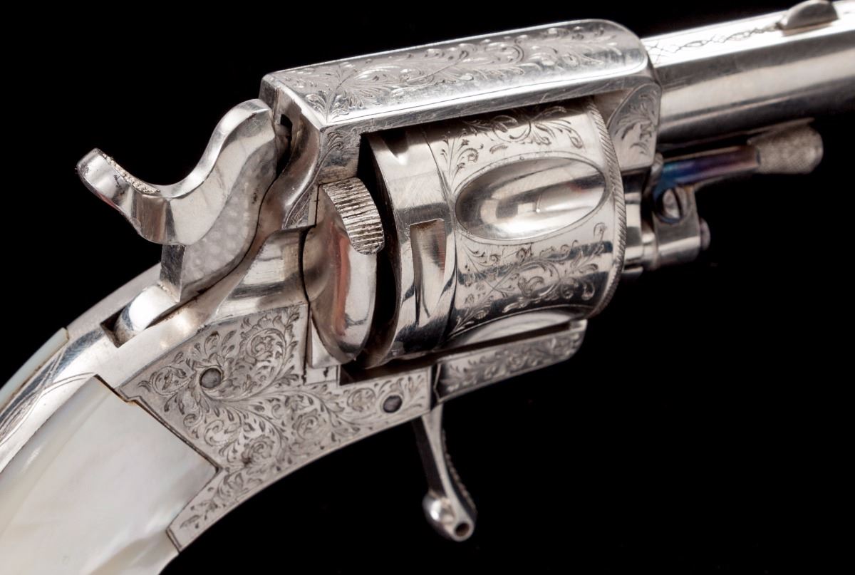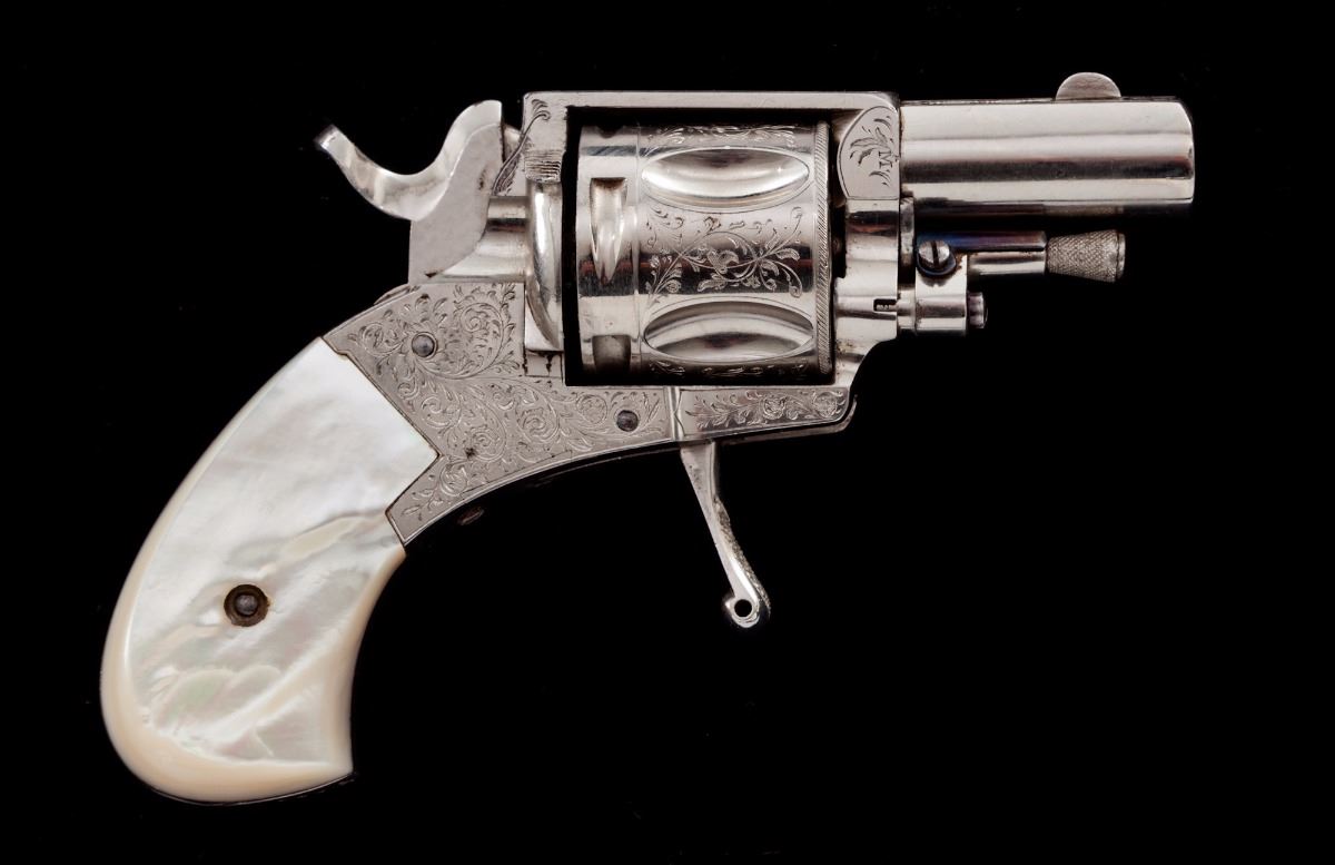 Antique Floral Spray Engraved Belgian Folding Trigger Double Action Revolver, in original pipe casing, #4309, .38 Short cal., 1-1/2'' barrel, finely engraved cylinder, frame and top of barrel; nickel plated, with mother of pearl slab type grips. Condition is excellent with small fingerprint size area of finish loss to left side of frame just behind trigger. Grips with small fissures to left panel and excellent iridescence. Action is fine, bore is bright. Moroccan leather pipe case shows moderate scuffs to exterior; blue velvet and satin interior shows some oil transfer and thinning near cylinder area. Est.: $1,200-$1,800. (Antique)