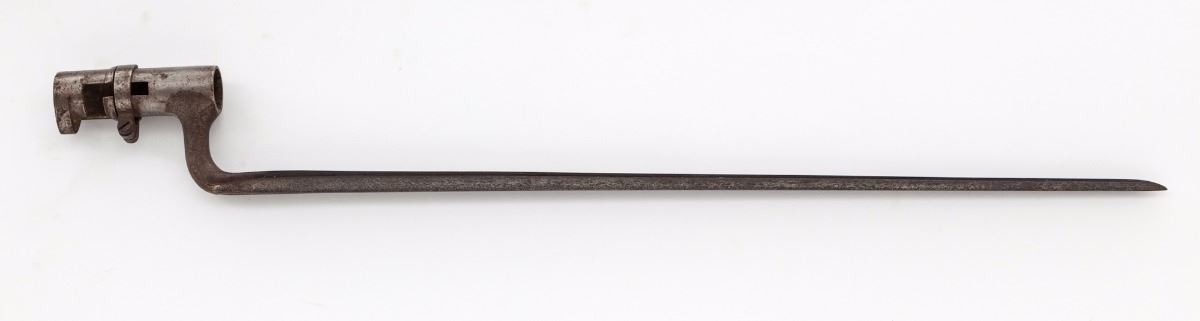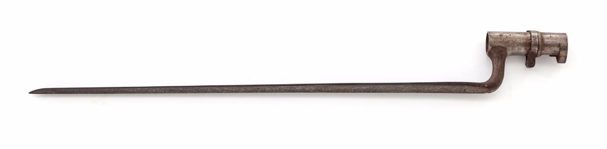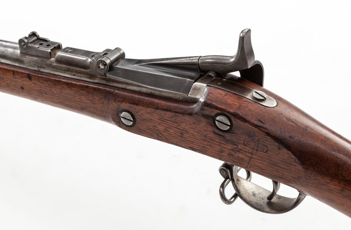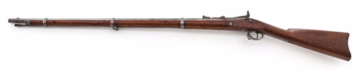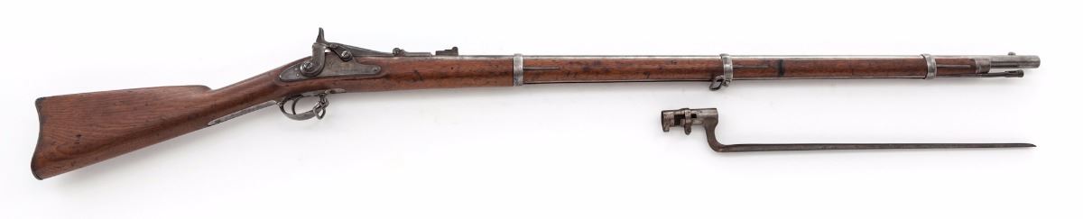 U.S. Model 1866 Allin Conversion Trapdoor Rifle, NVSN, .50-70 cal., 36'' bright barrel, case hardened lock, cartouched walnut stock with three steel bands. Ramrod is present, along with bayonet (no scabbard). Condition is very good to near fine with light to moderate carbon spotting to bright surfaces. Nicely cartouched stock with scuffs, scratches, and small fissure emanating from apex of lockplate. Bore is mirror bright. Est.: $700-$1,000. (Antique)