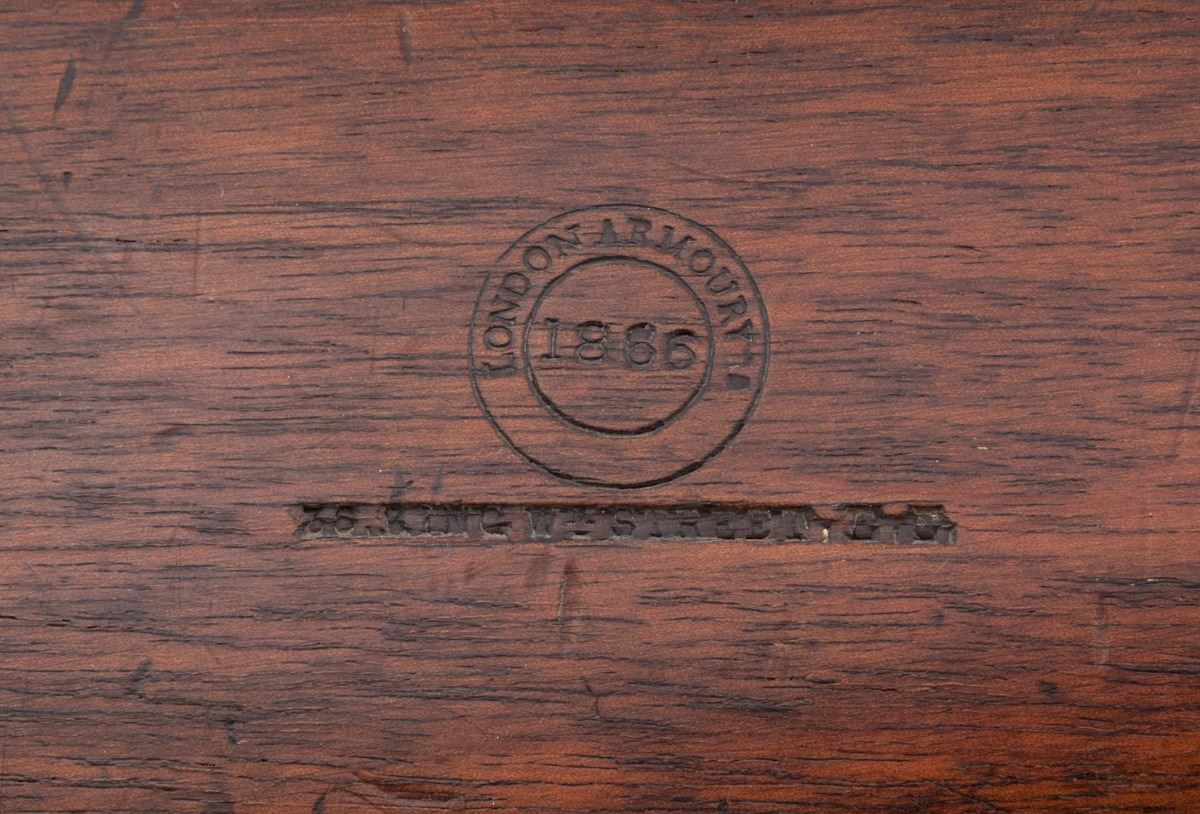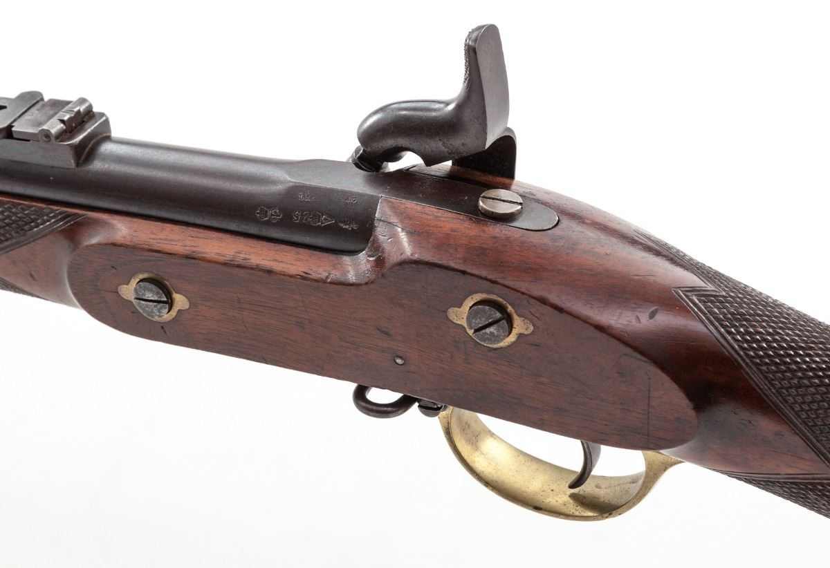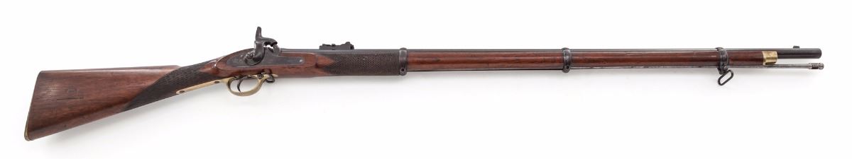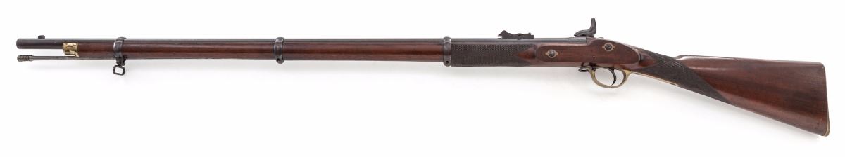 Rare Post-Civil War London Armoury Co. Enfield Pattern 1853 Percussion Musket, NVSN, 39'' blue finish, .577'' bore round barrel with 3-groove rifling, folding rear ladder sight is stamped ''L.A.'' on base of ladder with graduations marked in 100 yard increments to 800 yards; small blade front sight is on a block riser, with ''L.A.Co.'' and London 25 ga. proofmarks on the barrel. Lock is case colored and hammer has a half-cock safety notch; lockplate has a ''(CROWN)/V.R'' symbol and is dated ''1865'' with an overstamped ''5'' above ''L.A.Co,''. Rifle has a full musket stock of varnished French walnut with sharp diamond checkered and bordered grip and forend, brass triggerguard, buttplate and forend cap, blued sling swivels, three barrel bands and a 39'' steel ramrod. Right side of stock has a roundel impressed ''LONDON ARMOURY/1866/36.KING Wm STREET.E.C.'' with a notable difference in font style of the two ''6'' stamps. Weight is 8-5/8 lbs. Condition is very good with a strong mainspring. bore is oxidized brown with patchy rust that may clean somewhat. Barrel, slings and bands have approx. 30% blue drifting to brown with light overall oxidation and pitting. Case colors have toned dark gray-brown, buffed ramrod has pinprick pitting and freckling, hammer screw is marred, and brass furniture has been cleaned. Stock has scattered dings and scratches with a light revarnish. Overall, an interesting musket with an unusual combination of stamps and dates appearing to be from the narrow time period between the end of the Civil War and the start of the Snider-Enfield Conversion era. Est.: $1,800-$2,400. (Antique)