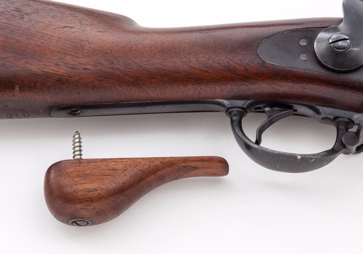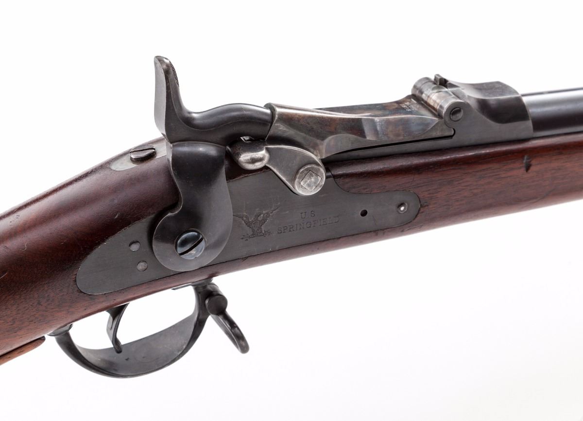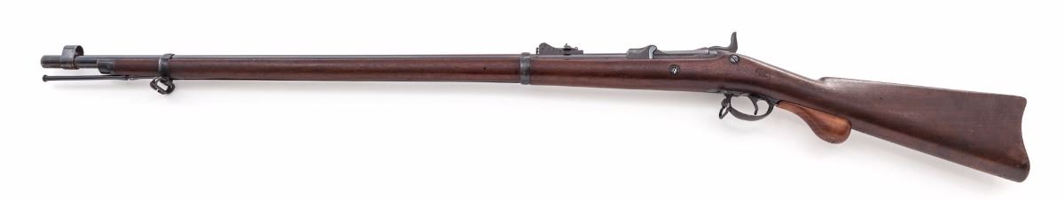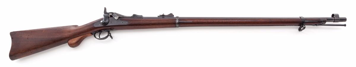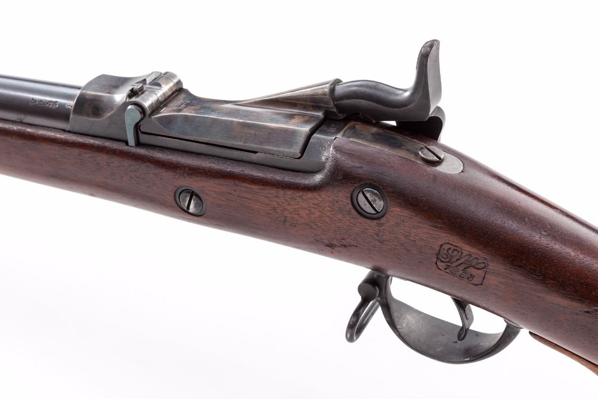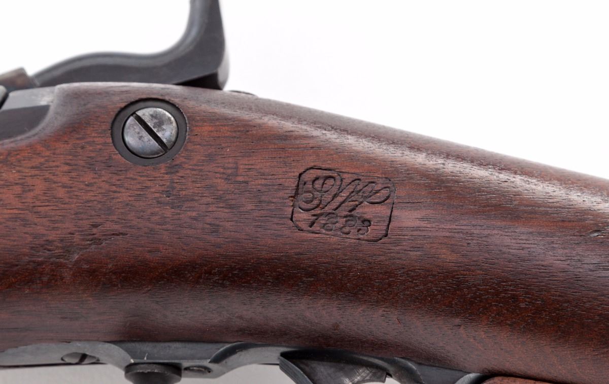 Springfield Armory Model 1873 Single Shot Trapdoor Rifle, #243969, .45-70 cal., 32'' barrel, blue finish, walnut two-band full-length stock, with two-piece standard sight and sight protector installed; rear sight is the 5th form buckhorn type. Breechblock is marked ''U.S. Model 1873'', and marked ''US'' on buttplate. Condition is near excellent retaining approx. 90% original rust blue finish which shows an even brown in a strong raking light. Breech and breech plug retain approx. 95% original case colors. Ramrod is the second style. Stock is in excellent original condition with strong cartouche ''SWP/1883''. ''P'' stock mark remains behind the triggerguard. Stock is fitted with an ''Officer's Model rifle'' type grip adapter, which is screwed into the rear triggerguard screw hole (could easily be replaced with a stock screw with no evidence of the adapter having been mounted). This is one of the nicest Trapdoors available. Action is tight, bore is bright and shows little evidence of firing. Est.: $1,500-$2,000. (Antique)
