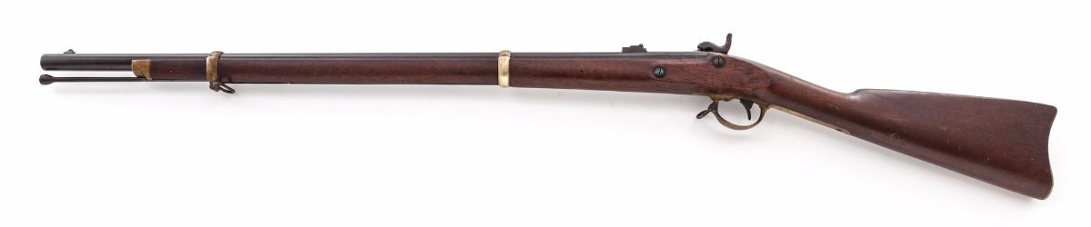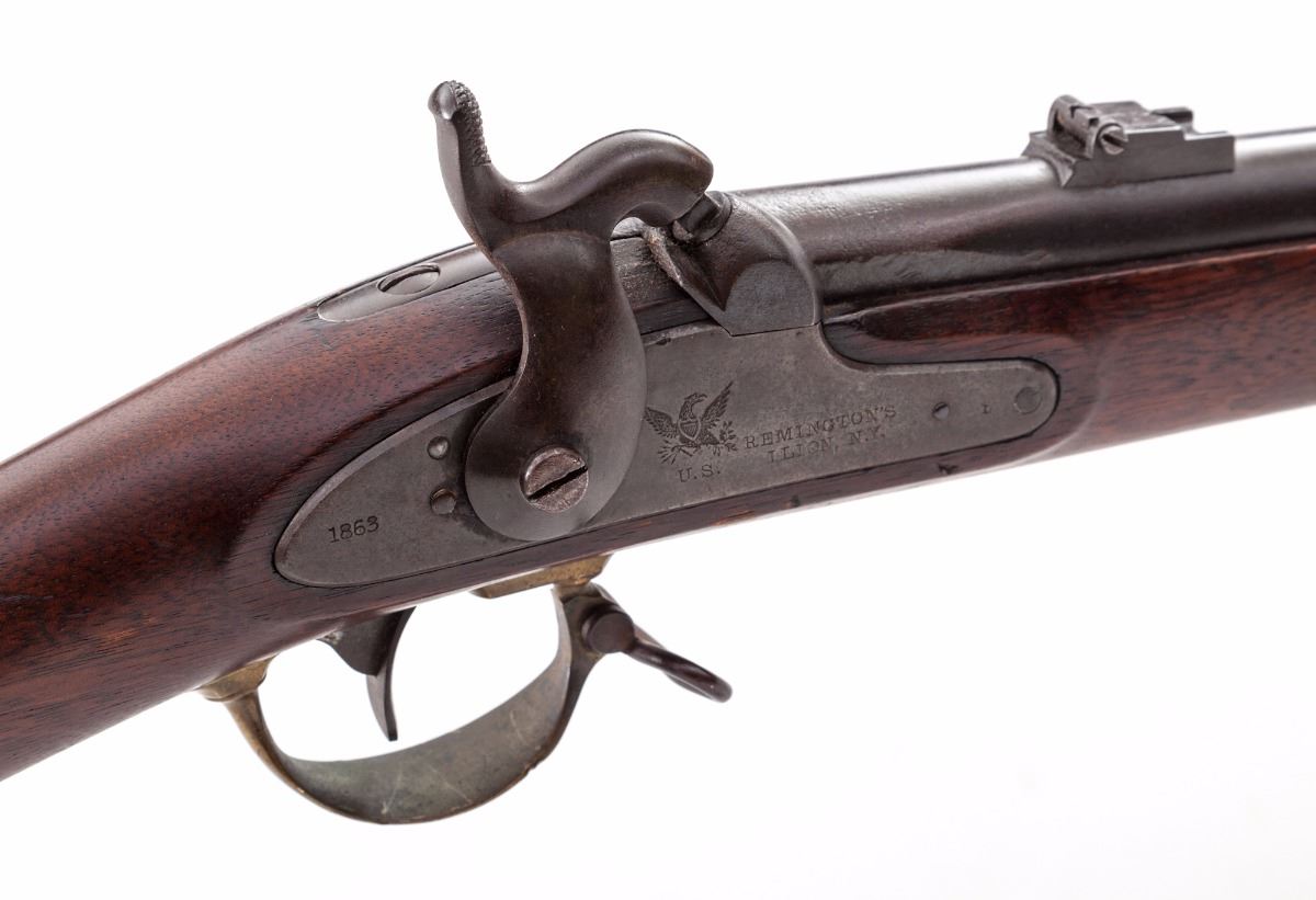Remington Model 1863 Zouave Percussion Rifle, NVSN, .58 cal., blue finish, 33'' round barrel with 7-groove rifling, walnut stock, sling swivels, bayonet lug, fixed blade front sight, folding rear sight, with brass barrel bands, triggerguard, buttplate and patchbox; includes tulip-head ramrod. Lock is marked with ''(eagle)/US'', ''Remington's / Ilion, N.Y.'', and dated 1863. Top of barrel is additionally dated 1863 with ''VP/(eagle's head)''; left side of barrel is marked ''STEEL H.S.L.''; left side of stock with two cartouches on the flat surface just above triggerguard; top of buttplate is marked ''U.S.'' and ''P''. Condition is very good to near fine. Barrel retains approx. 80% darkening blue. Lock and hammer with dark spotting and lock with trace amounts of case coloring remaining. Lock markings remain mostly clear; top of barrel near date with some fine corrosion. Stock with nicely visible cartouche and normal signs of age and wear. Brass hardware with mild even toning. Rear barrel band may have been cleaned at some point. Action is crisp, bore is very good with well-defined rifling, in need of a thorough cleaning. Est.: $2,200-$2,800. (Antique)