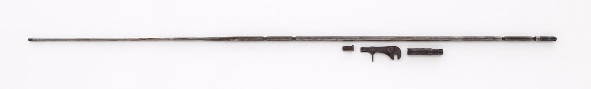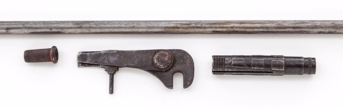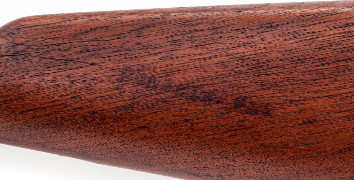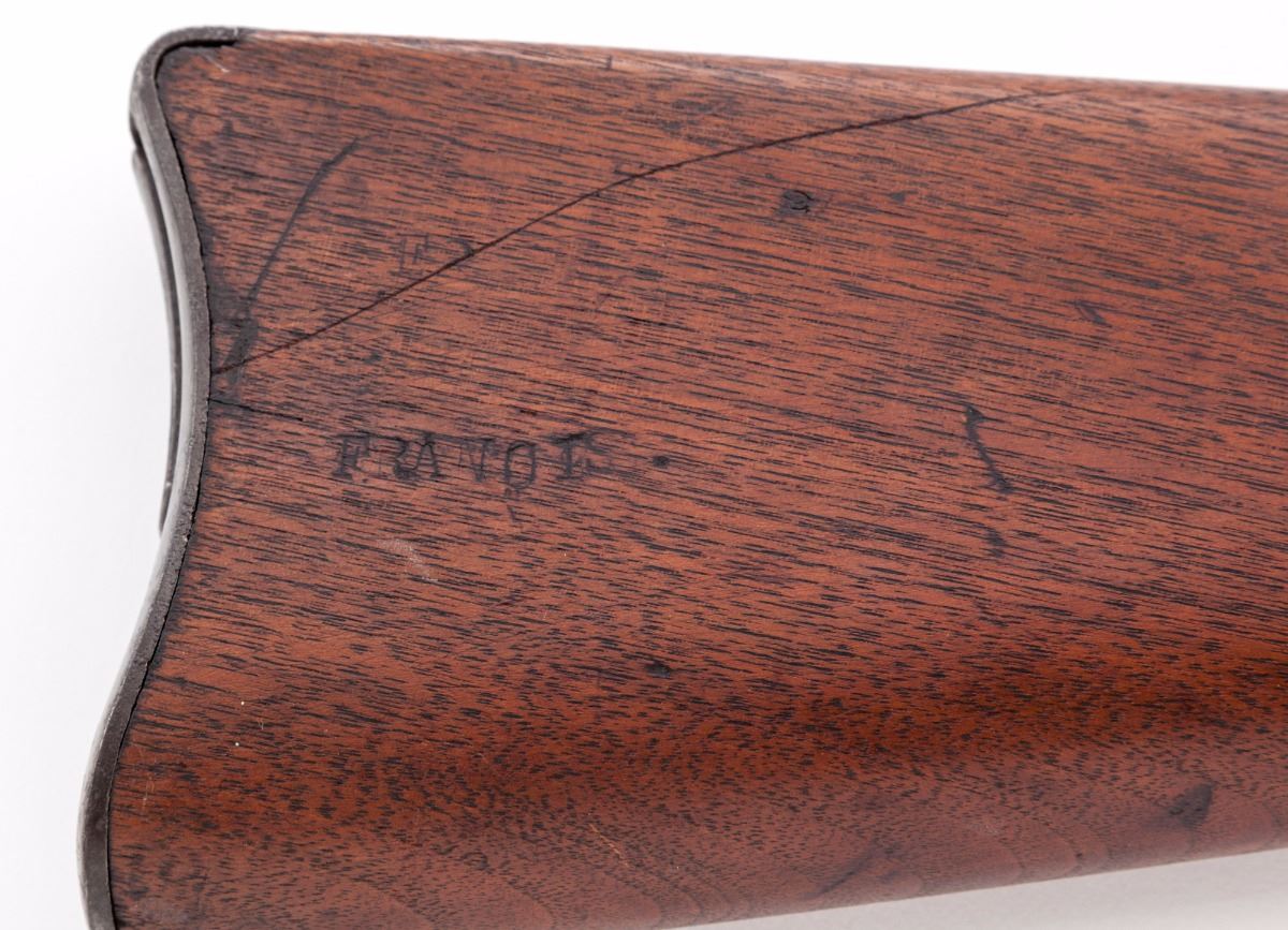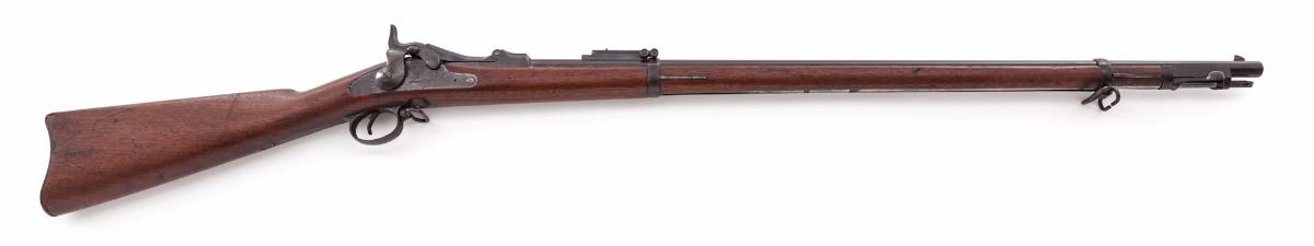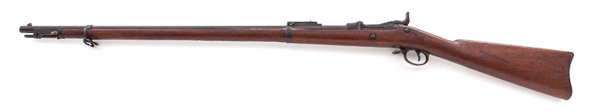 Springfield Armory Model 1888 Rod Bayonet Single Shot Trapdoor Rifle, #504734, .45-70 cal., 32'' barrel, blue finish, walnut two-band full-length stock, with ''US'' marked on buttplate and 2nd Model Buffington rear sight; breech is marked ''U.S. Model 1884''. Condition is good with an even brown patina to all surfaces and areas of corrosion near the muzzle. Stock is very good as lightly cleaned; cartouche is visible but hard to read. An unknown marking for some organization is present on left side of buttstock. Butt trap contains the multi-purpose tool, cleaning rod tip and headless shell extractor. Included with this rifle is a reprint of the pamphlet ''Rules for the Management of the Springfield Rifle, Carbine''. Action is tight, bore is dark with areas of corrosion. Est.: $700-$1,000. (Antique)