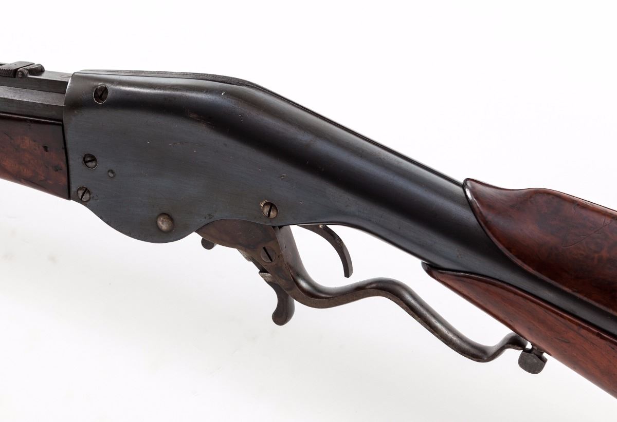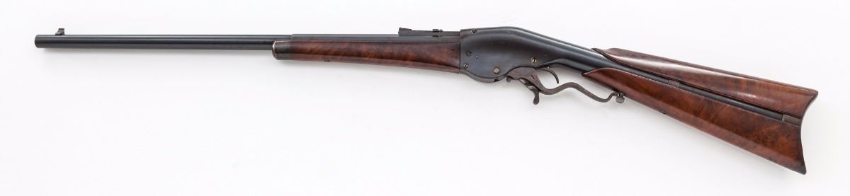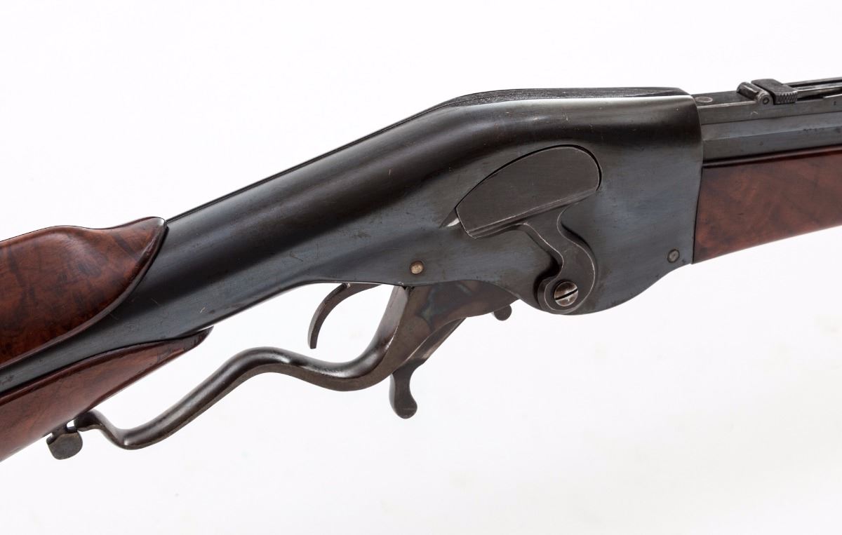 Evans Single Shot Lever Action Sporting Rifle, NVSN, .44 Evans CF cal., 26'' part-round barrel, case hardened lever, burl walnut buttstock and fancy forend, musket style rear sight, steel bead factory front sight, machine matted receiver top, with barrel marked ''Evans Repeating Rifle. Mechanic Falls, ME. Pat. Dec. 8, 1868 & Sep. 16, 1871 U.S.A.'' Condition is excellent retaining approx. 96% blue with just the lightest thinning to high edges and to domes of screw heads. Case hardened lever shows approx. 85% vivid colors with some speckling to bottom rear portion of lever. Stunning burlwood buttstock shows rich and vibrant flames with only the lightest marks from handling. Fancy grade forend with light scuffs. Action is crisp, bore is bright. Est.: $1,800-$2,400. (Antique)
