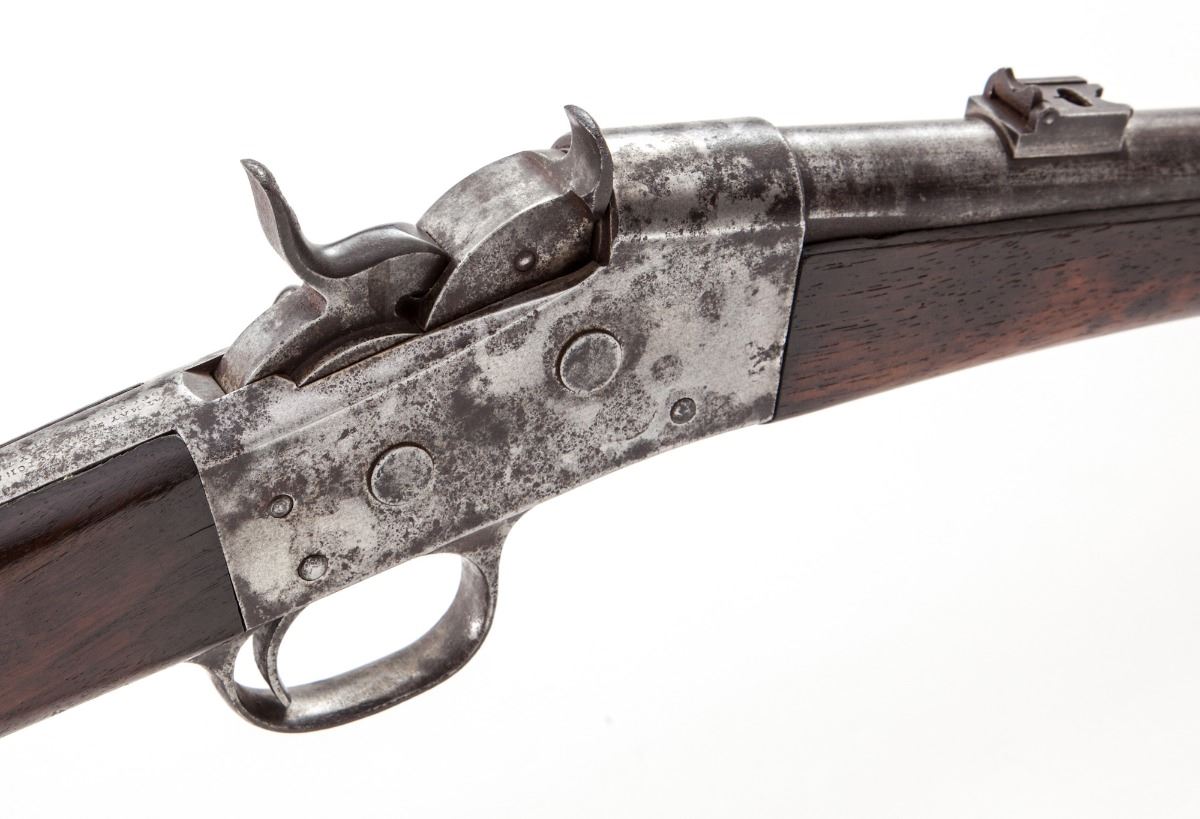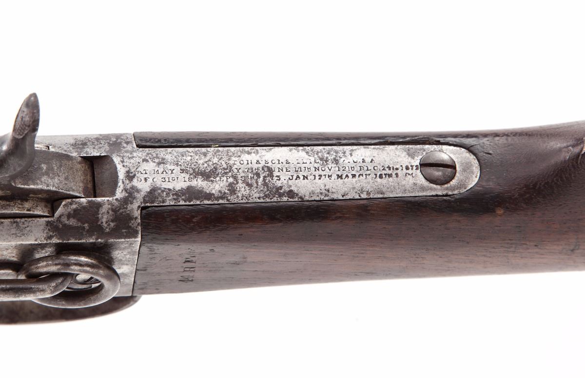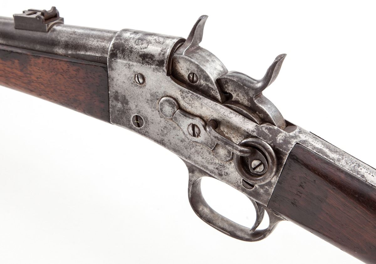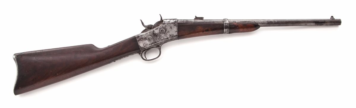 Rare .44 RF Cal. Remington Light Baby Carbine, #1251, 18” blue barrel, straight walnut stock and forend, with standard sights. Stock marked “44 RF”. Considered scarce with very few early examples being mfg’d in .44 RF cal., with the majority being chambered in .44-40, and considered more scarce in blue. Last patent date March 18, 1874. Left side of barrel marked with the letter “B”. Condition is good retaining approx. 10%-20% original blue, most of which has darkened or thinned to bright; receiver with patches of dark oxidation and corrosion. Stock shows light scuffs but moderate oil darkening at metal surfaces; buttplate has toned brown. Action is good, bore is fine. Est.: $2,000-$4,000. (Antique)