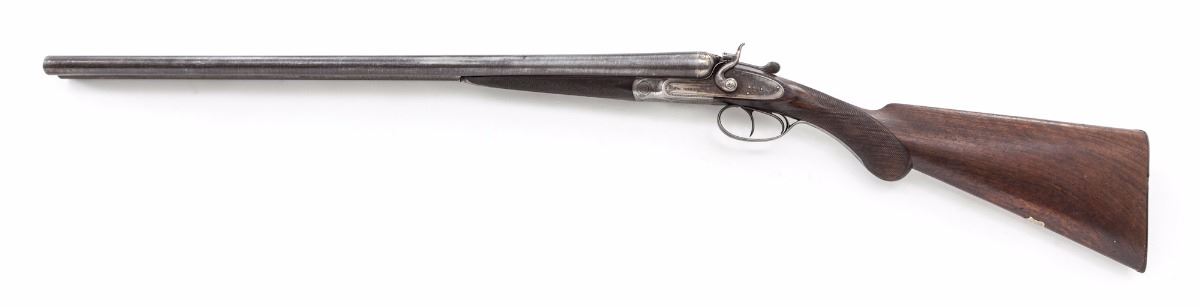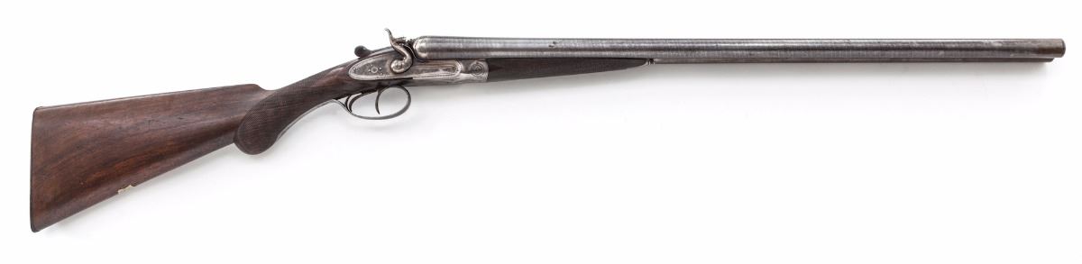 Historic August Francotte ''Improved Featherweight'' Side-by-Side Hammer Shotgun, #16438, 12 ga., 2-3/4'' chs., with 25-1/2'' browned Damascus steel barrels inscribed ''A. Francotte Gun Maker'', ''Patentee London'', with a 3/8'' concave matted rib and front silver bead; bores measure approx. .729''/.720'' with .030''/.033'' wall thickness and .037''/.011'' choke constrictions; barrels are individually numbered 16438 and 16478 and have double underlugs, a single top crossbolt and extractor; barrel flats have Belgian black powder proofs with correct A. Francotte stamps. Case-colored frame has back-action locks, rebounding hammers and double triggers; engraving is exceptionally fine 3/4 coverage scroll with highlighted borders. The round knob walnut stock and Anson release splinter forend have 20 line-per-inch flat diamond checkering with a light oil finish; length of pull is 14-3/16'' to a checkered horn buttplate, drop at comb is 1-13/16'', drop at heel is 2-13/16'', weight is just under 5-3/8 lbs. Toe line of the stock has a silver shield inscribed ''John Kemmerer 1888''. The extensive history of the Kemmerer railroad and mining family of Pennsylvania, along with additional details of the gun, are discussed at length in the accompanying article ''The John L. Kemmerer Francotte'', by Alexander J. Deatherage, published in the Winter 2010 issue of The Double Gun Journal. Overall mechanical condition remains very good with tight bolting and strong mainsprings. Triggers are firm with accumulated dry oil on the lower tang and inletting; chambers and bores are shiny with a few thin oxidation patches and scattered light indentations in the barrel walls; muzzle edges are slightly worn and the front bead is a replacement; the rib extension and action face at the right striker are chaffed. Barrels have 30% mottled brown with silvering along the sides; frame has 20% remaining case colors with silvered handling areas. Stock and checkering have overall scratches and scrapes with handling wear and dryness; buttplate has a 1/2'' side chip. Est.: $3,000-$5,000. (Antique)