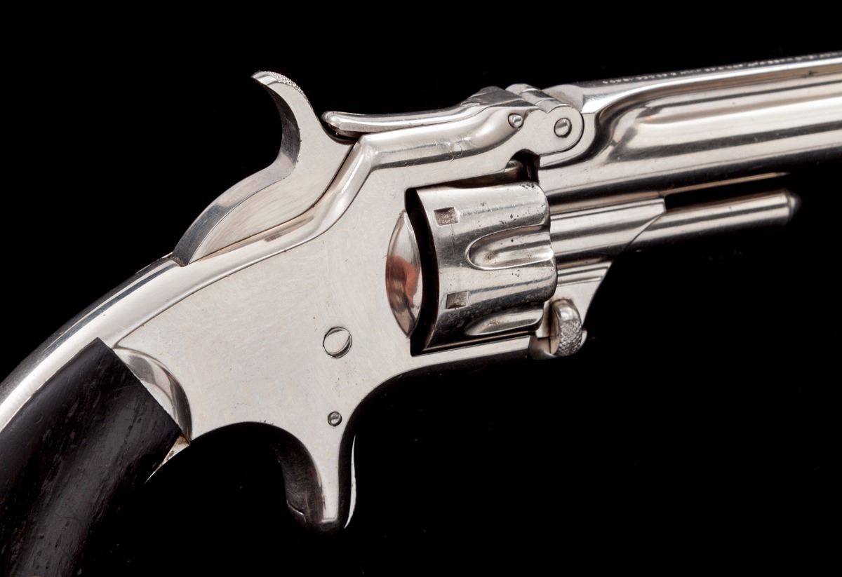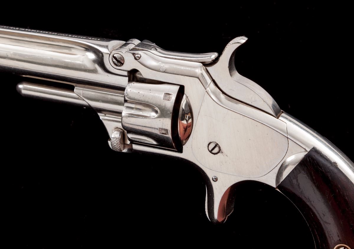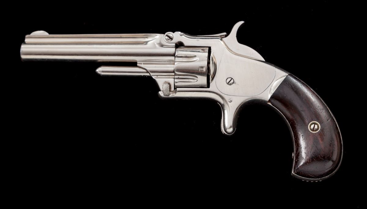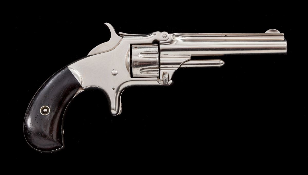 Smith & Wesson 3rd Issue Model 1 Spurtrigger Revolver, #43596, .22 RF Short cal., 3-1/4'' barrel, nickel finish, rosewood grips. Mfg'd from 1868-1881. Condition is near excellent retaining approx. 97% original finish. Grips with light dings and scuffs, but most all of their original varnish remains. Action is good, bore is very good. Est.: $600-$800. (Antique)