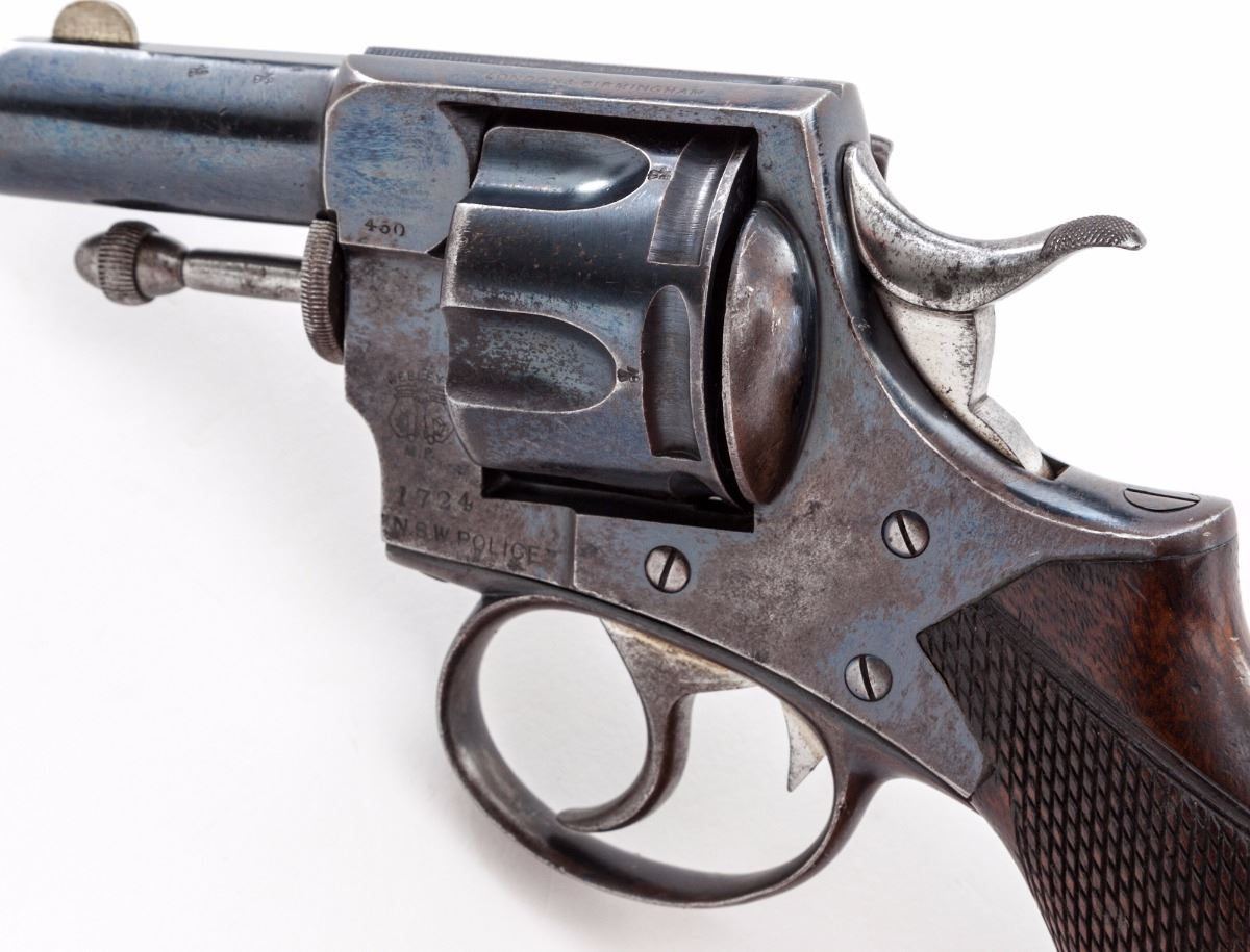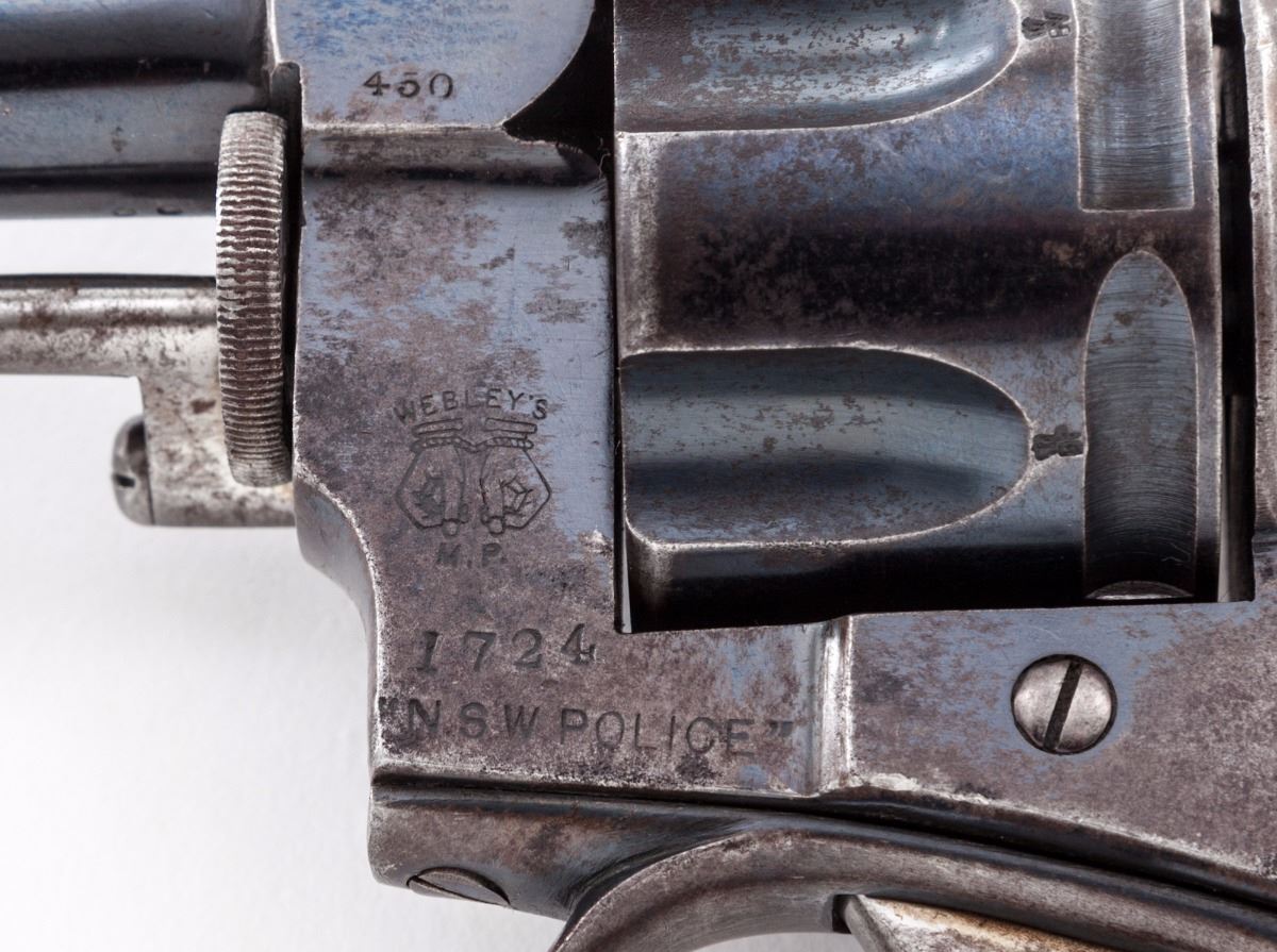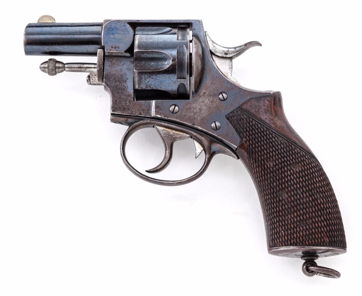 Webley New South Wales Constabulary Model Double Action Revolver, #92500, .450 cal., 2-1/2'' barrel, blue finish, one-piece walnut grips with lanyard loop in butt; nickel silver front sight, with New South Wales, Australia, police number 1724 and Webley's handcuff logo to left side of frame. Top strap marked ''P. Webley & Son, London & Birmingham''. Condition is very good to near fine retaining approx. 60% flaking blue, with moderate scuffs to grips. Action is crisp, bore is fine. Est.: $500-$750. (Antique)