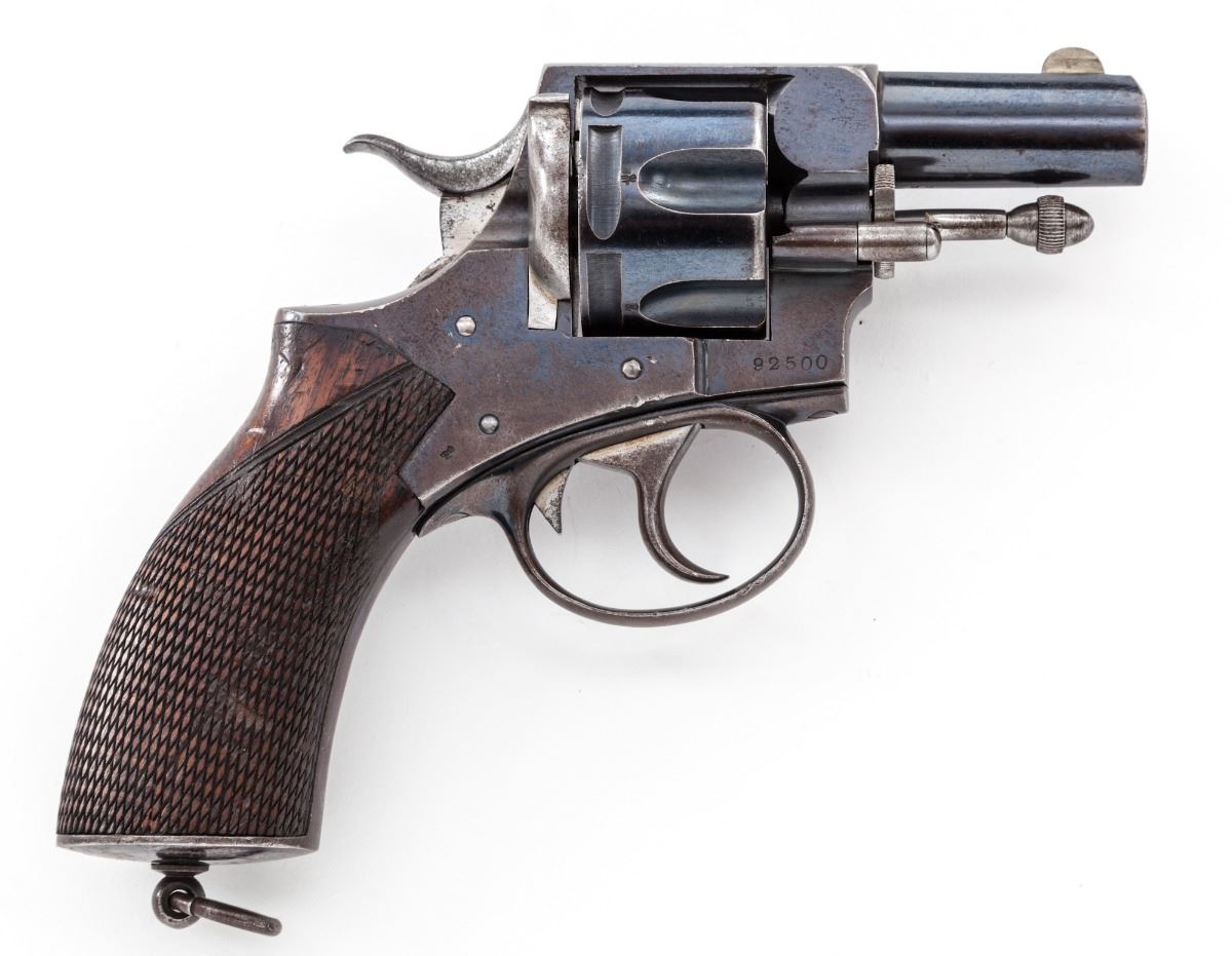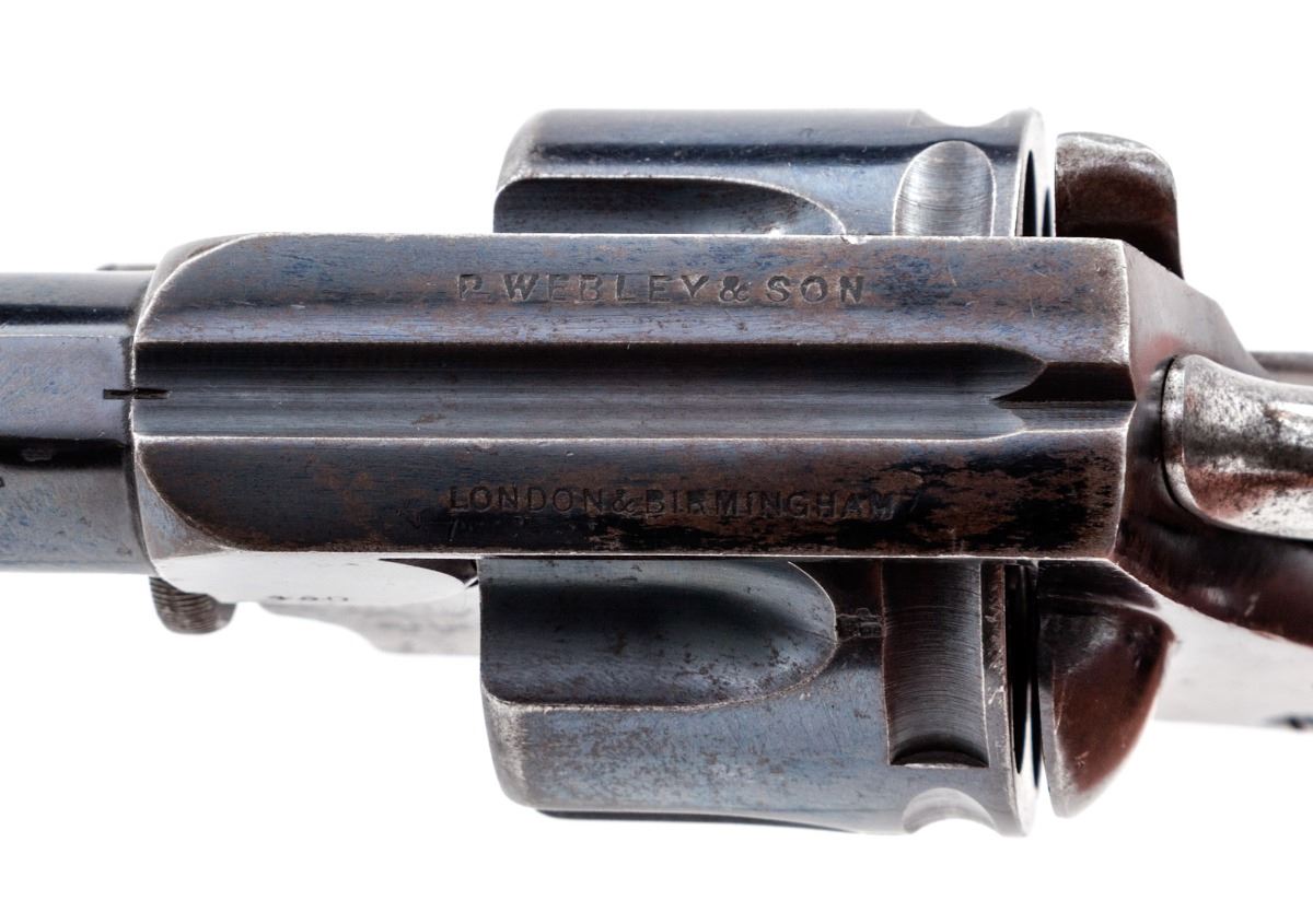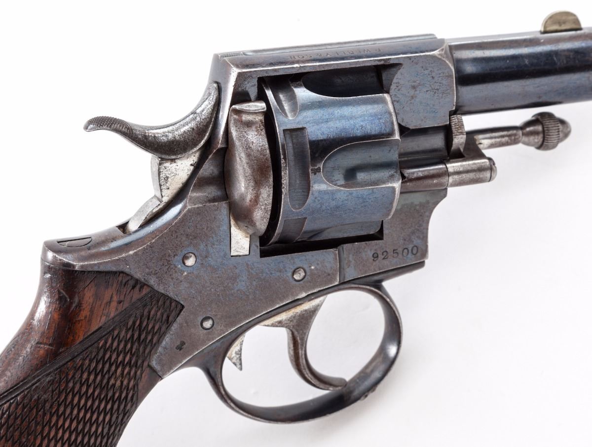Webley New South Wales Constabulary Model Double Action Revolver, #92500, .450 cal., 2-1/2'' barrel, blue finish, one-piece walnut grips with lanyard loop in butt; nickel silver front sight, with New South Wales, Australia, police number 1724 and Webley's handcuff logo to left side of frame. Top strap marked ''P. Webley & Son, London & Birmingham''. Condition is very good to near fine retaining approx. 60% flaking blue, with moderate scuffs to grips. Action is crisp, bore is fine. Est.: $500-$750. (Antique)