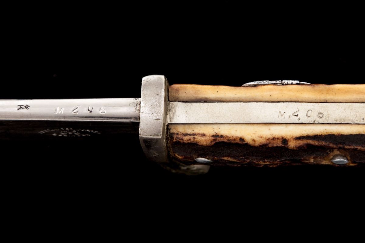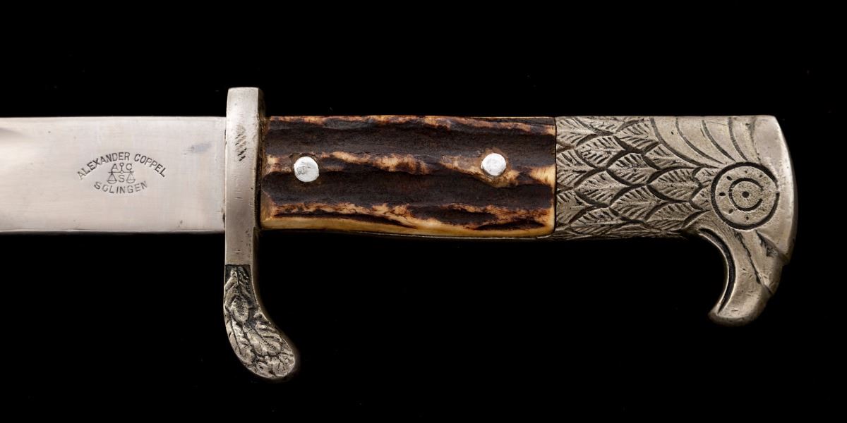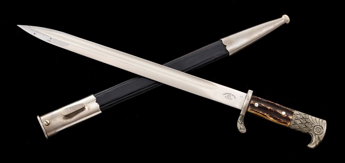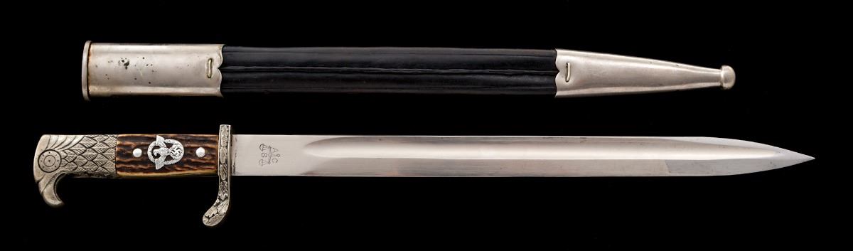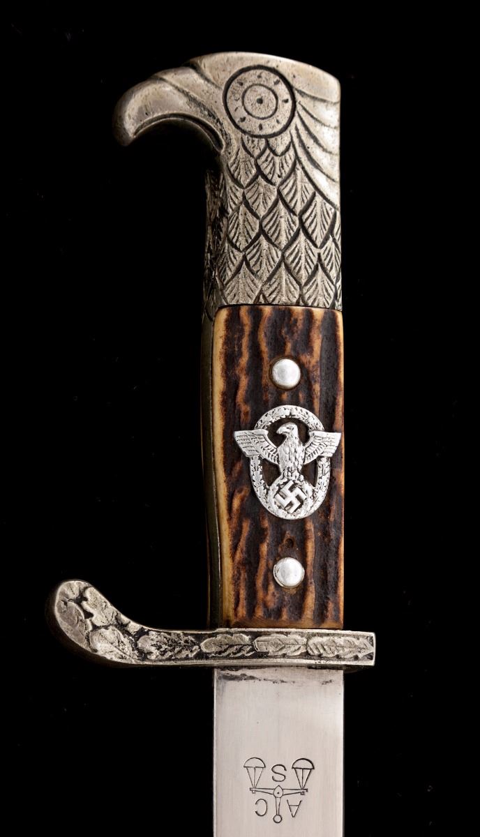 WWII German Police Bayonet: Un-slotted sidearm bayonet with all nickel fittings throughout; bright 13'' blade with blood groove marked ''Alexander Coppel, Solingen'', typical stag grip panels with right side having aluminum Police insignia. In black leather scabbard with nickel fittings. This police sidearm is not unit marked and is in overall very good to excellent condition. Est.: $400-$600.