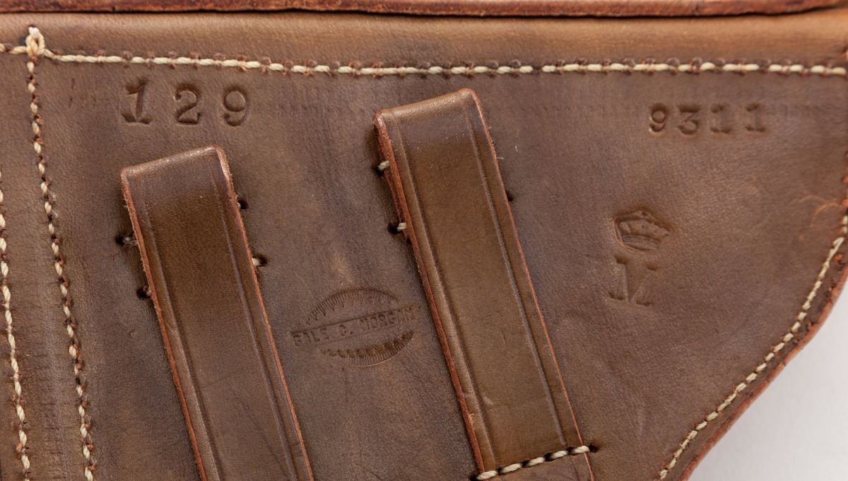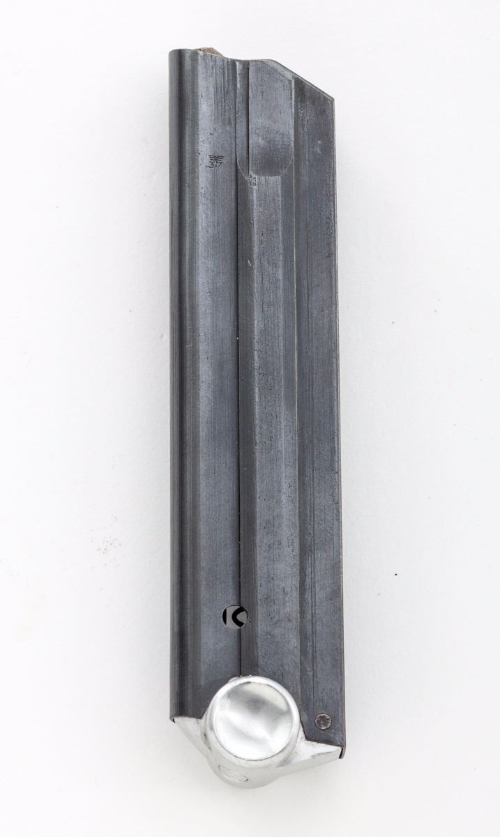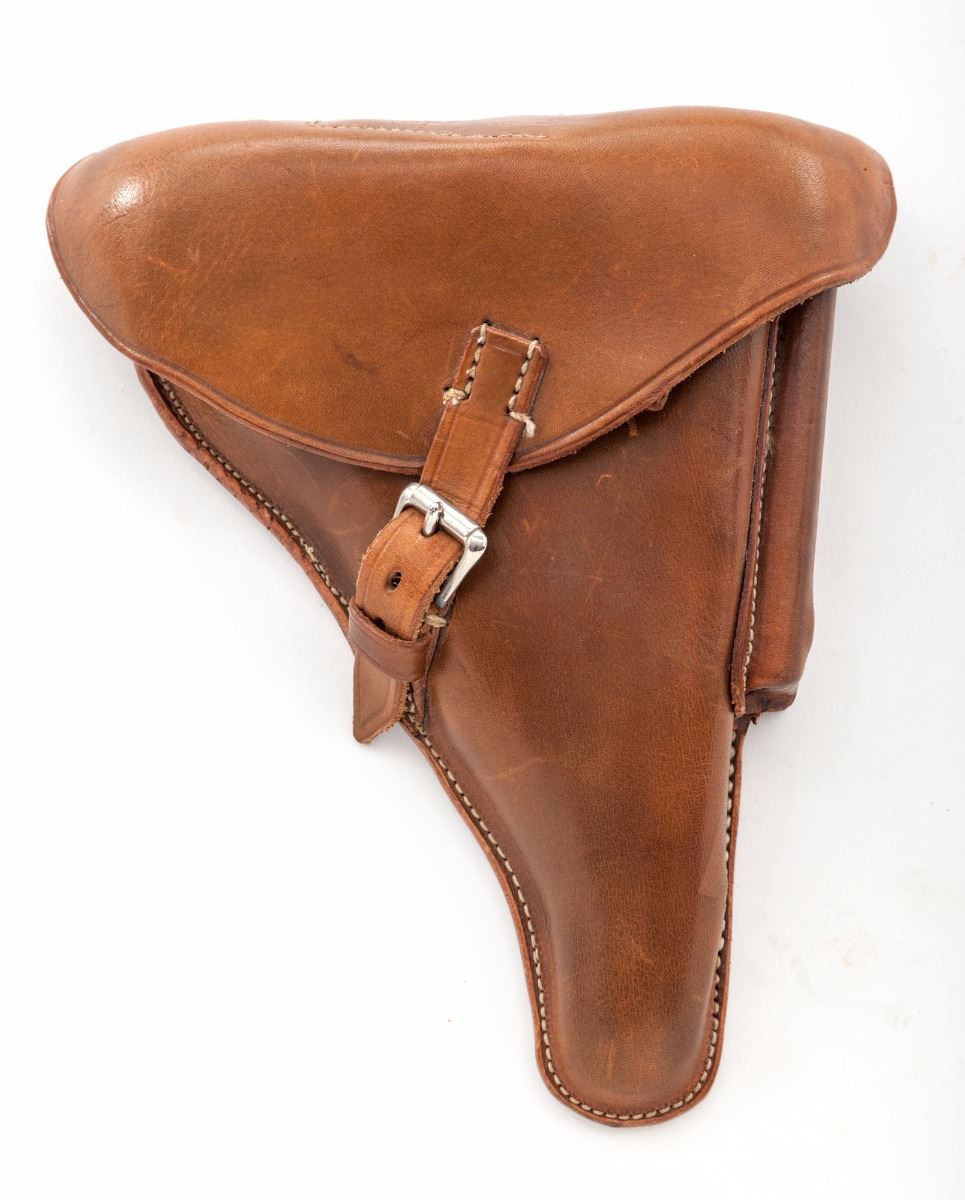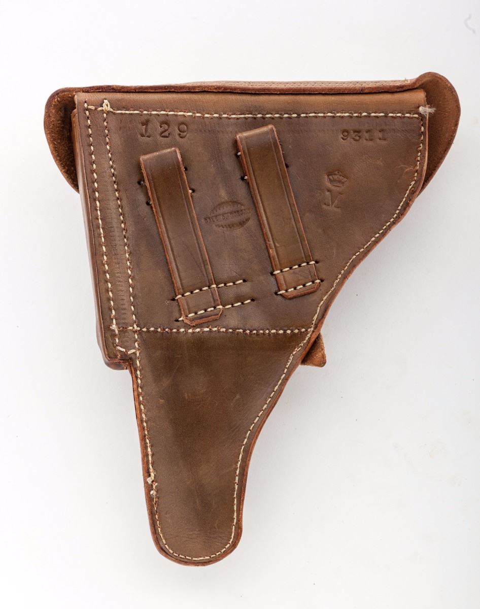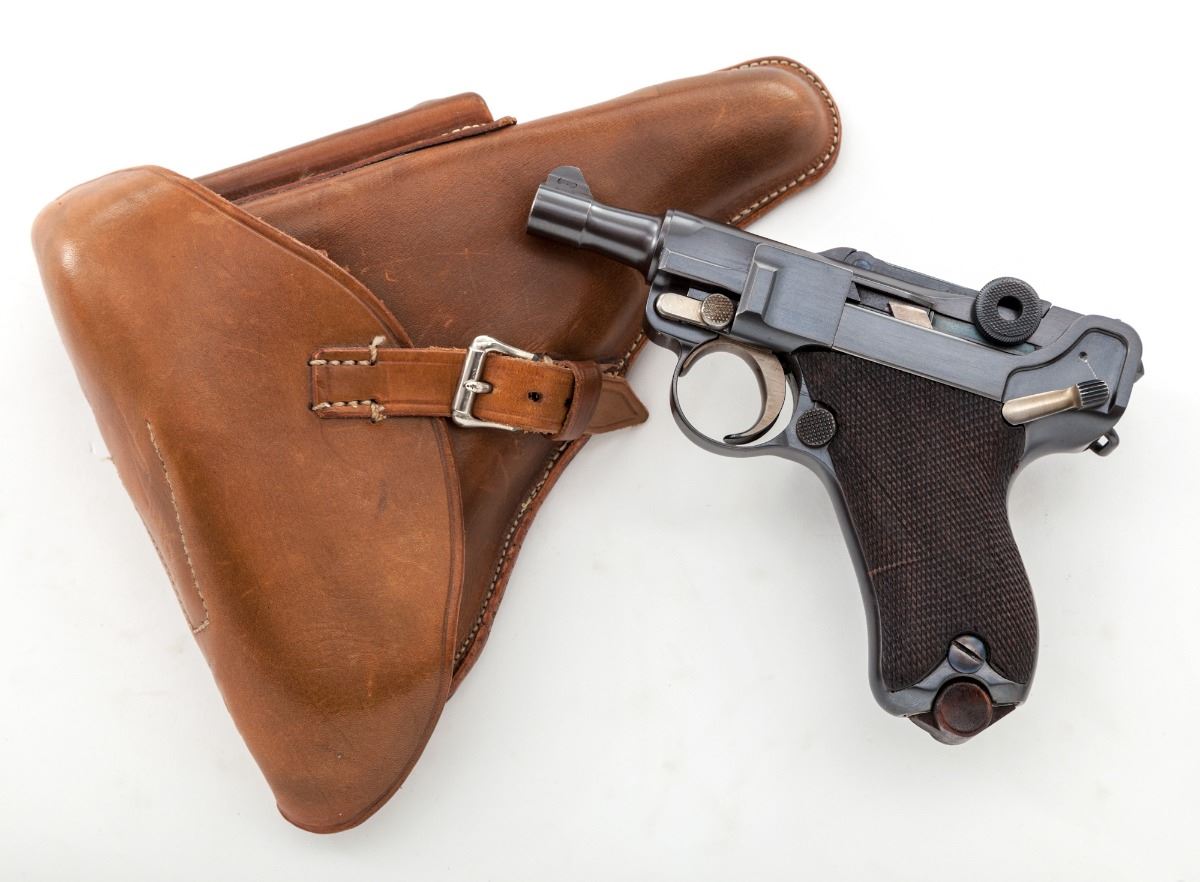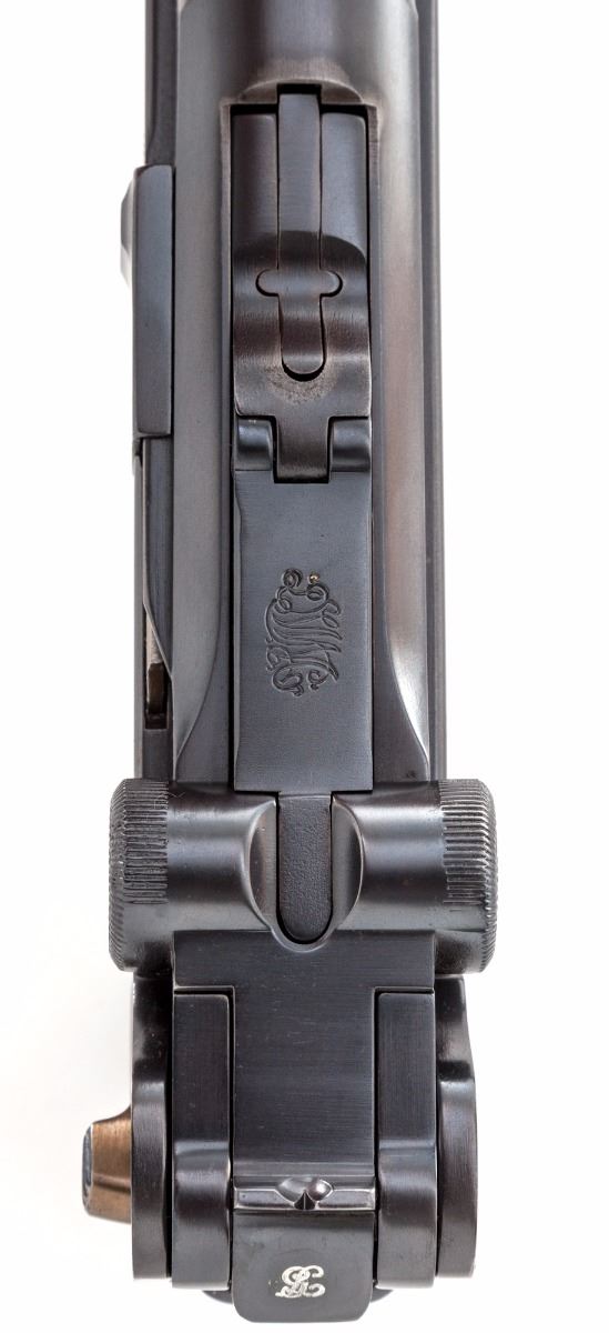 John Martz Baby Luger Semi-Automatic Pistol, #7263, 9mm, 2-1/4'' barrel, blue finish, straw small parts, checkered walnut grips, with one extra magazine marked ''JVM'', in custom Gale Morgan leather holster with combination tool. Additionally marked ''GL'' (Georg Luger) behind sight of rear toggle link, as were the originals. John Martz's craftmanship is the subject of many magazine articles and often featured on the cover of such publications as ''Gun World''. Condition is excellent showing just slight thinning to domes of grip screws. Grips with minor flattening. Action is crisp, bore is bright. Holster with just the lightest scuffs. Est.: $3,500-$5,000. (C&R)