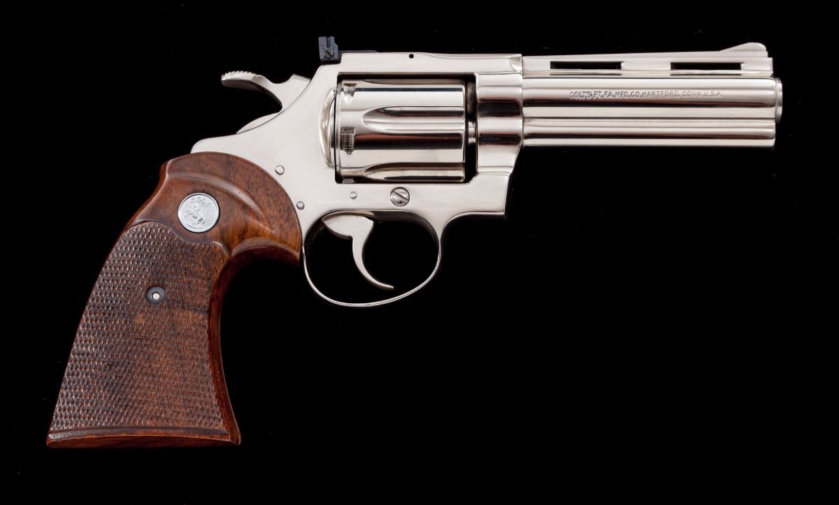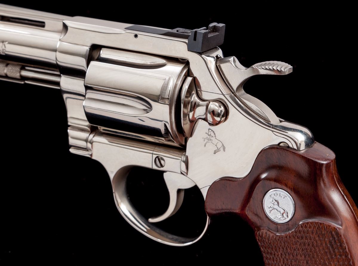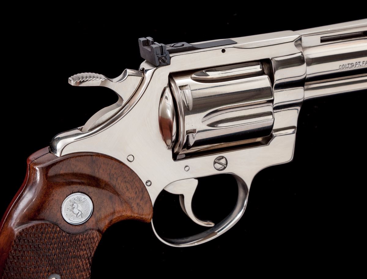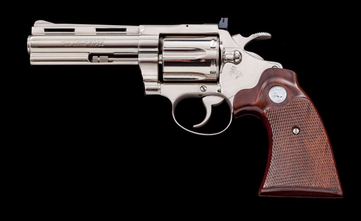 Nickel Finished Colt Diamondback Double Action Revolver, #R20049, .22 LR cal., 4'' vent rib barrel, nickel finish, factory checkered walnut grips with inlaid Colt medallions, fixed blade front sight, with adjustable rear sight. Mfg'd 1978. Condition is excellent overall. Nickel finish with a few small pinprick imperfections mainly to the left side near the Colt logo and near the muzzle area. Grips with a few minor impressions and crisp checkering. Action and bore are excellent. Est.: $1,750-$2,500. (Modern) (Not available to Calif. residents.)