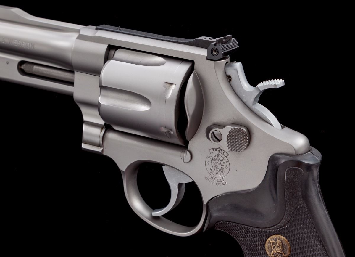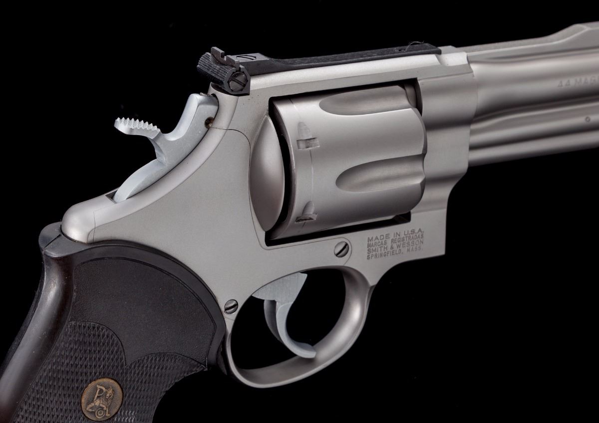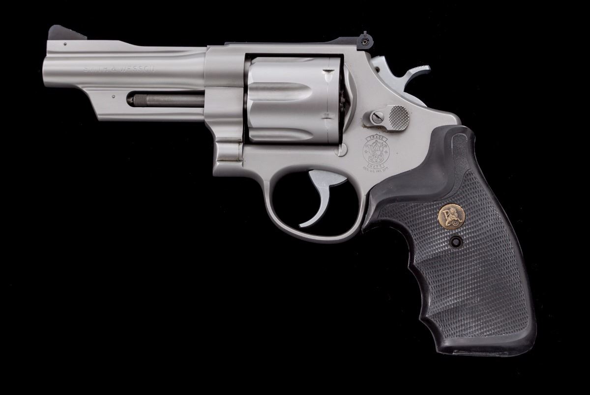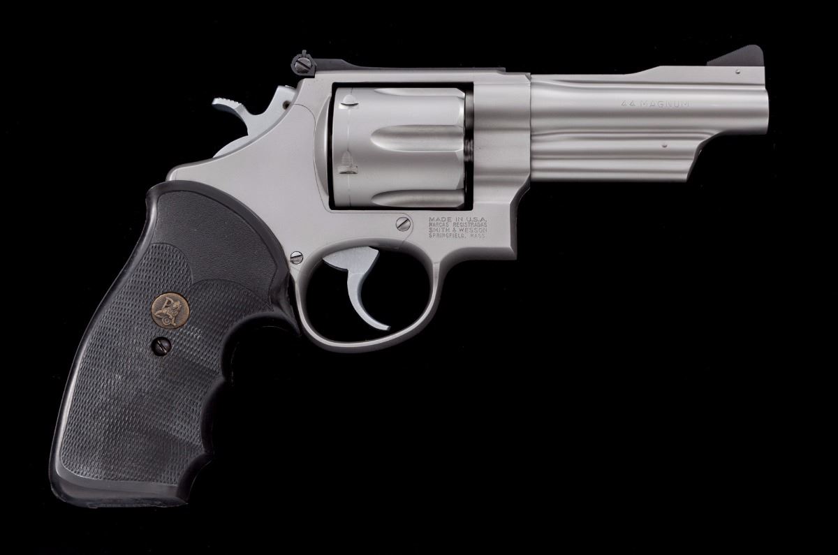 Smith & Wesson Model 629-2 Double Action Revolver, #BEA0835, .44 mag. cal., 4'' barrel, matte stainless finish, checkered black rubber Pachmayr Gripper grips, checkered hammer, pinned blade front sight, with adjustable rear sight. Condition is excellent, showing normal signs of use. Cylinder with a moderate dragline. Metal surfaces with a few general light marks from handling. Grips show crisp checkering. Action and bore are excellent. Est.: $600-$900. (Modern) (Not available to Calif. residents.)