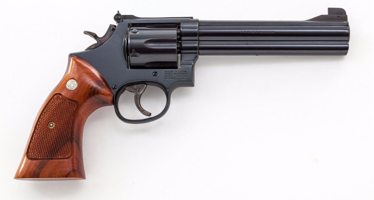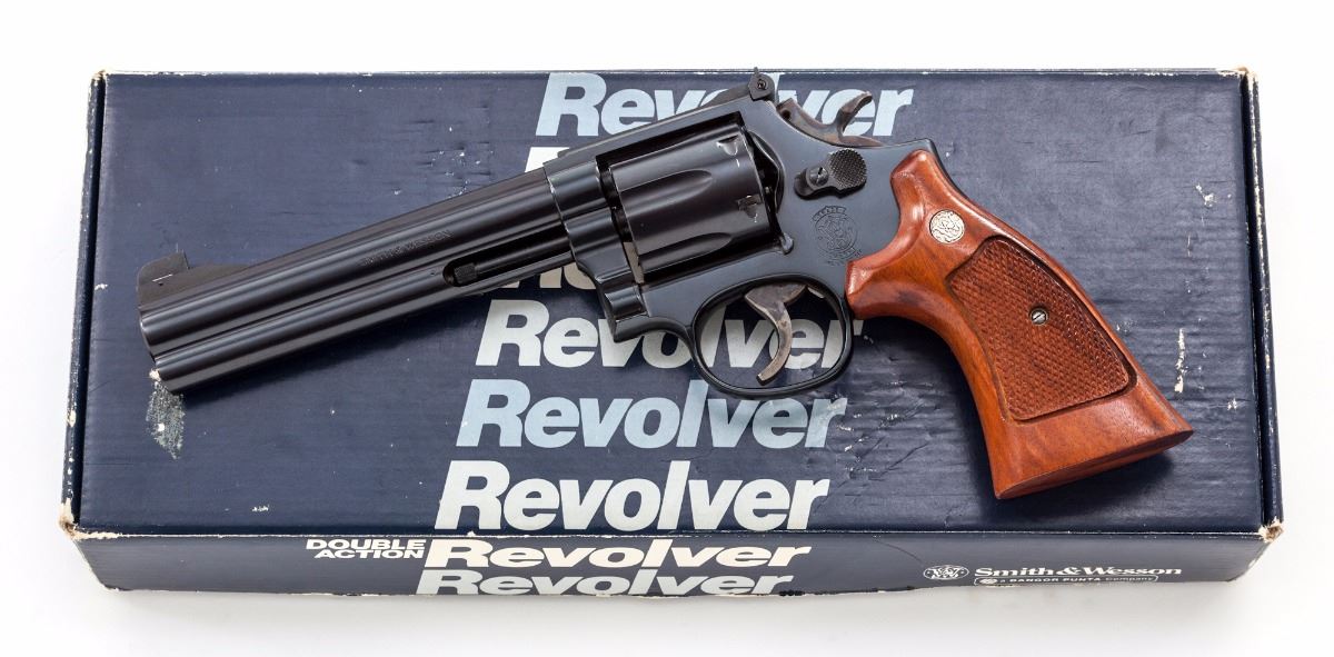 Smith & Wesson Model 586 Distinguished Combat Magnum Double Action Revolver, #AAJ8963, .357 mag. cal., 6'' barrel, dark blue finish, case hardened hammer and trigger, Patridge front sight and notched adjustable rear sight, factory checkered hardwood grips with inlaid S&W medallions, in original S&W blue box with matching end label, owner's manual and factory cleaning accessories. Condition is near excellent retaining approx. 98% blue, with scattered light marks from handling and light dragline; approx. 85% case colors remain with a few patches of fine surface rust to both sides of trigger. Grips with sharp checkering and a few small scuffs and impressions. Action is crisp, bore is excellent. Est.: $500-$750. (Modern/PPT)
