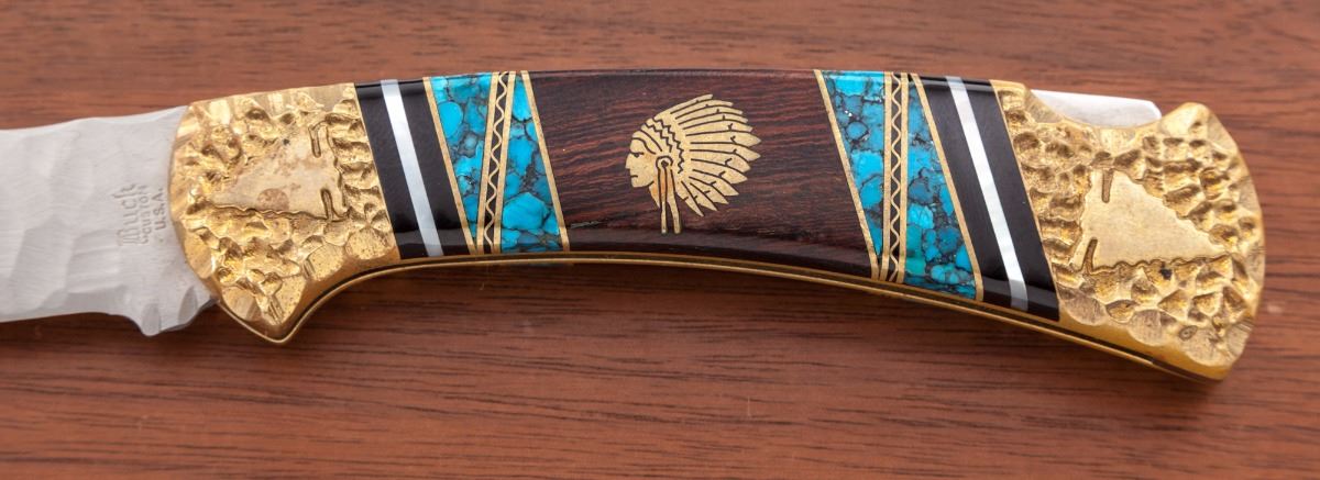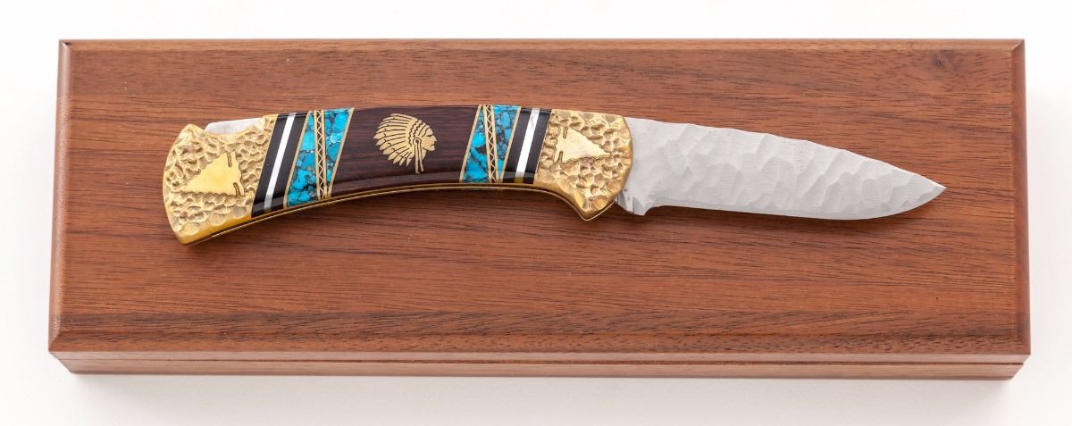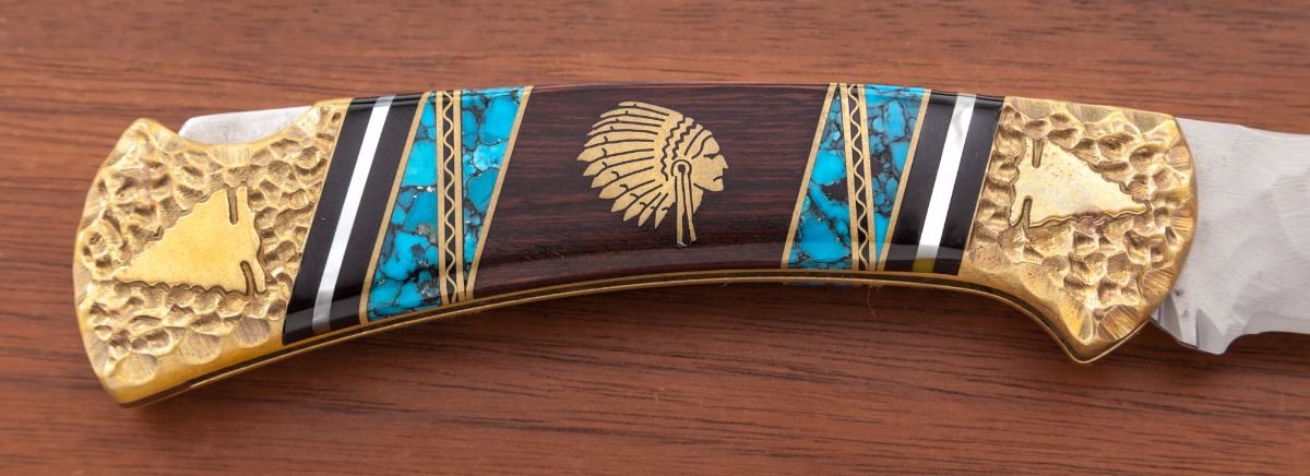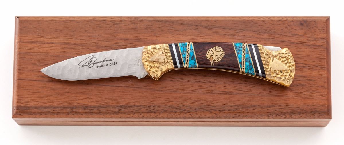 Buck Custom #109 ''Man Speaking Peace'' Folding Knife, by David Yellowhorse, 2-7/8'' chip flint blade marked with David Yellowhorse signature and serial #367; 4-1/4'' overall closed length, brass textured bolsters with Indian head design; grip is made of a decorative combination of black jet, mother of pearl, turquoise, and desert ironwood with Indian head brass inlays. Included is the original fitted maroon velvet-lined oak display case with decorative brass plaque. Condition is excellent and as new showing no signs of use. Brass parts with mild toning. Velvet case lining shows light to moderate wear from storage. A beautiful high quality custom made folding knife. Est.: $400-$600.