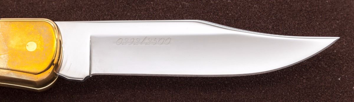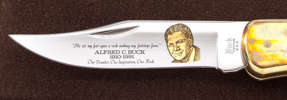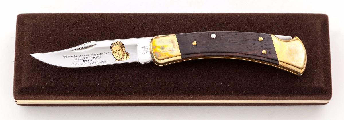 Limited Edition Buck Custom Alfred C. Buck Memorial Lock-Back Folding Knife, #292/2500, 3-3/4'' blade with gold etched portrait of Alfred C. Buck on left side, as well as memorial inscription; overall closed length is 4-7/8'', brass bolsters, smooth wood grips with brass pins, as well as the original fitted brown felt display case with Certificate of Authenticity and the original slipcover. Mfg'd 1991. Condition is excellent, appearing as new. Bolsters with some micro-scratching and mild even toning. Est.: $200-$400.