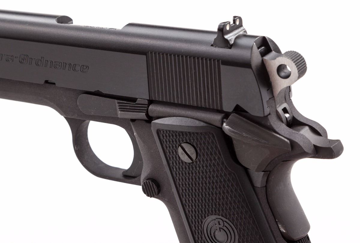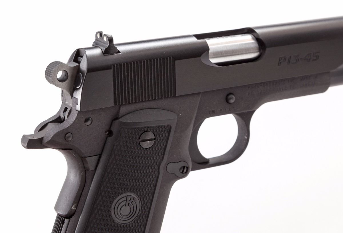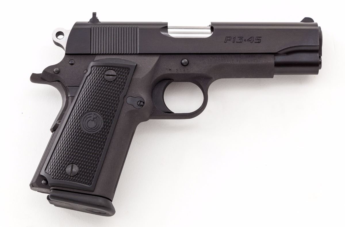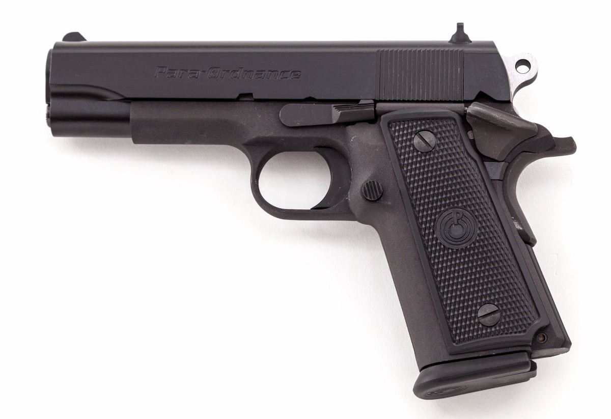 Para-Ordnance Model P13 Semi-Automatic Pistol, #RM5145, .45 ACP cal., 4.25'' barrel, black slide, matte black frame, factory Para-Ordnance checkered black plastic grips, serrated front and back grip strap, beavertail grip safety, stainless steel hammer, fixed white dot front sight, white two-dot rear sight, with one factory high-capacity magazine. Condition is excellent, appearing near new. Matte surfaces with scattered light marks from handling. Slide shows minimal marks. Action and bore are excellent. Est.: $450-$650. (Modern/PPT) (High cap mags not available to Calif. residents.)