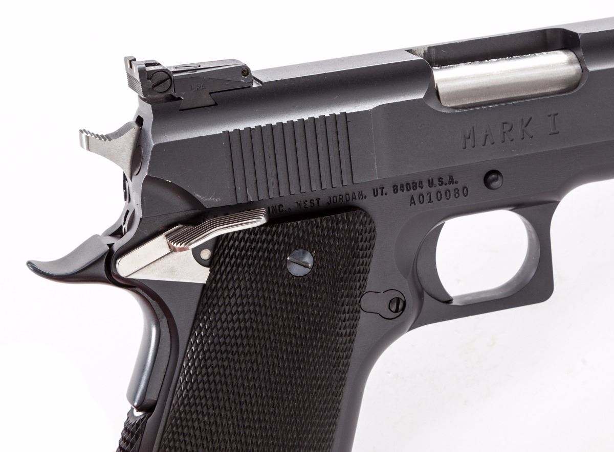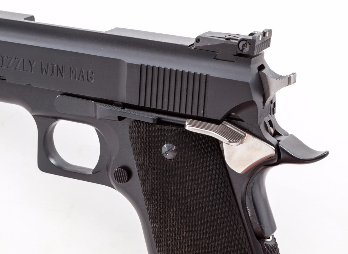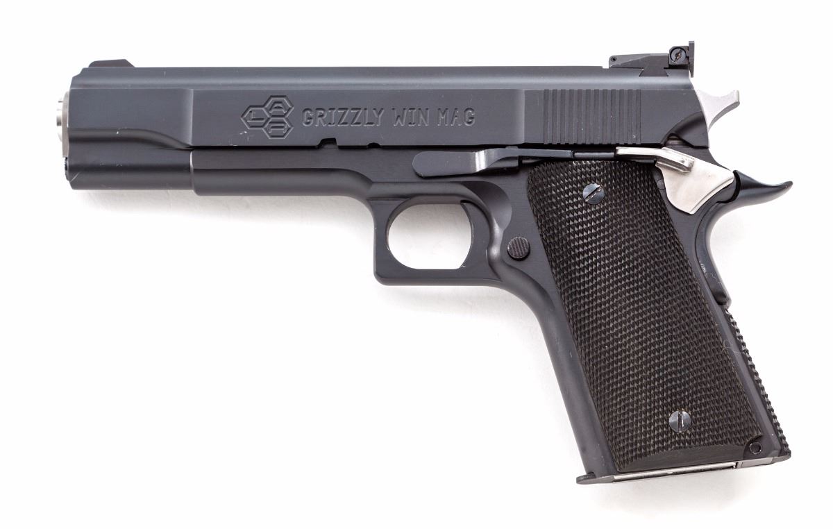 LAR Grizzly MK I Semi-Automatic Pistol, #A010080, .45 Win. mag. cal., 5-1/2'' barrel, matte black finish, black checkered hard rubber grips, ambidextrous thumb safety, beavertail grip safety, checkered back grip strap, white dot front sight, adjustable two-dot white rear sight, serrated trigger and hammer, with one factory magazine. Condition is excellent. Matte metal surfaces show light marks from handling, as well as scattered fine marks and impressions to high edges, and small loss to finish on inside edge of slide near ejection port. Grips, action and bore are like new. Est.: $1,200-$1,800. (Modern/PPT)