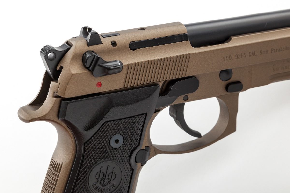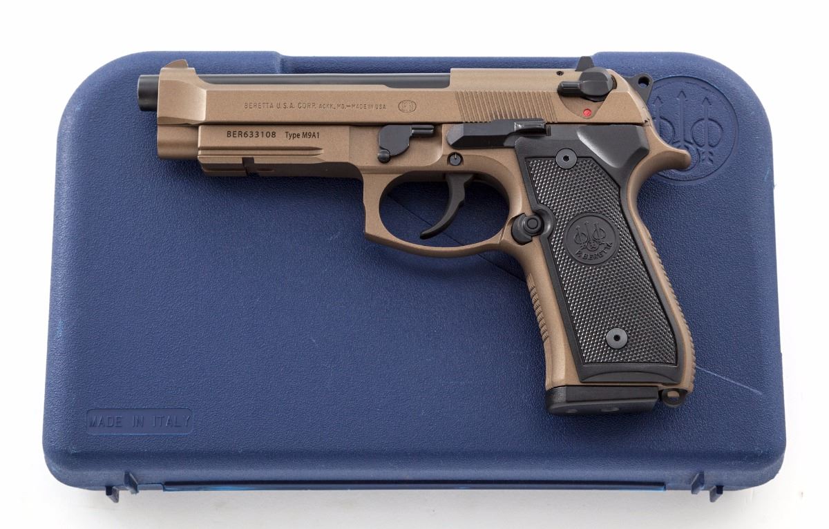 Beretta Model 92FS Type M9A1 Semi-Automatic Double/Single Action Pistol, #BER633108, 9mm, 4.9'' blue barrel, bronze cerakote finish, checkered Beretta hard plastic grips, with ambidextrous safety/decocking lever and three-dot sight system. In Beretta blue hard case with owner's manual and five (5) total factory 10-round magazines. Condition is excellent, showing signs of light use, including a few small marks to top of barrel. Action and bore are like new. Est.: $600-$800. (Modern/PPT)