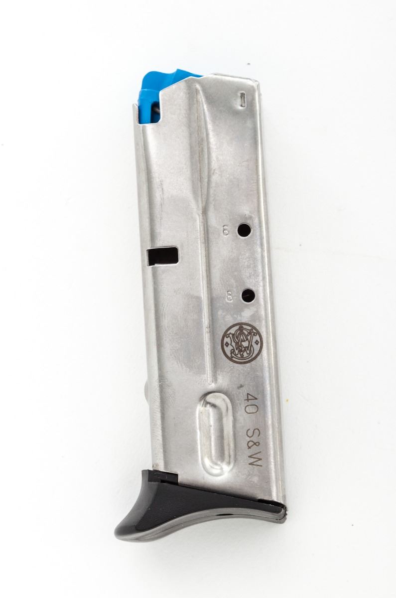 Smith & Wesson Model 4013 TSW Tactical DA/SA Semi-Automatic Pistol, #MSE3267, .40 S&W cal., 3-1/2'' barrel, satin finished aluminum alloy frame, stainless steel slide, factory black plastic S&W grips, checkered front grip strap, white three-dot sights, ambidextrous safety/decocking lever, concealed hammer, two factory 9-round finger extension magazines, in original S&W blue hard case with matching end label, owner's manual and associated paperwork, as well as original S&W packing paper. Condition is excellent, appearing as new, showing very little use. Decocking lever with a small amount of faint dark spotting from prolonged contact with foam in case. Action and bore are excellent. Est.: $600-$800. (Modern/PPT)