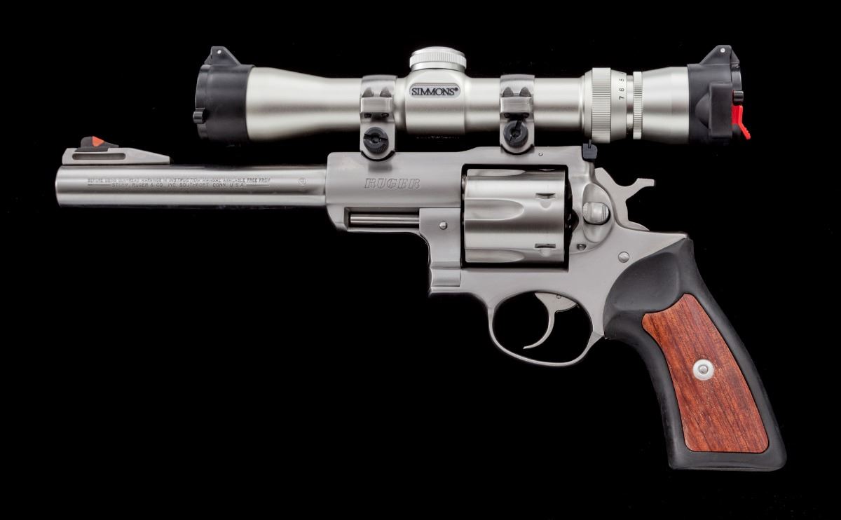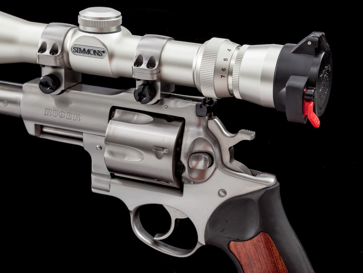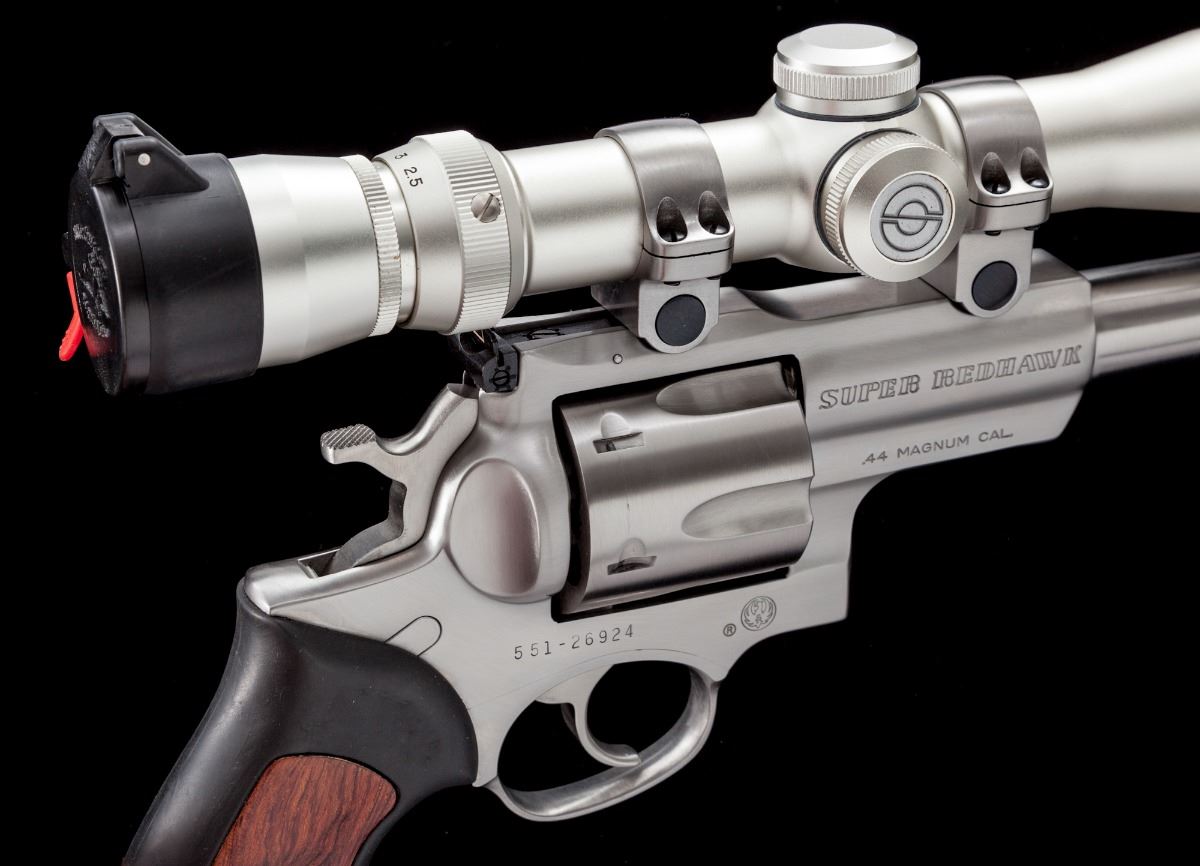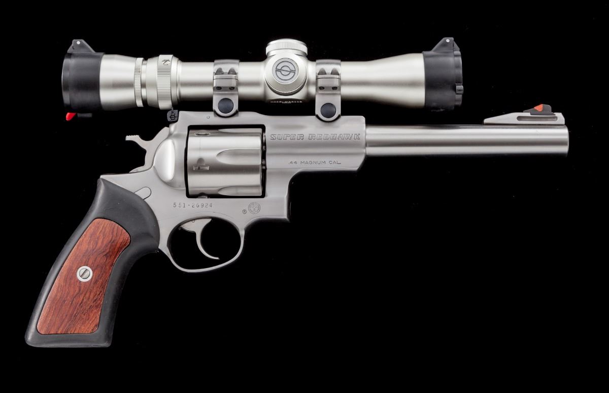 Scoped Ruger Super Redhawk Double Action Revolver, #551-26924, .44 mag. cal., 7-1/2'' barrel, stainless steel, black rubber grips with wood inlay, checkered hammer, red ramp front sight and adjustable rear sight. Topped with a Simmons 2.5-7x28 scope. Condition is excellent. Metal surfaces with scattered light marks from handling. Cylinder with a faint dragline. Grips with fine impressions to rubber pieces. Action is crisp, bore is mirror bright, scope optics are clear. Est.: $700-$900. (Modern/PPT)