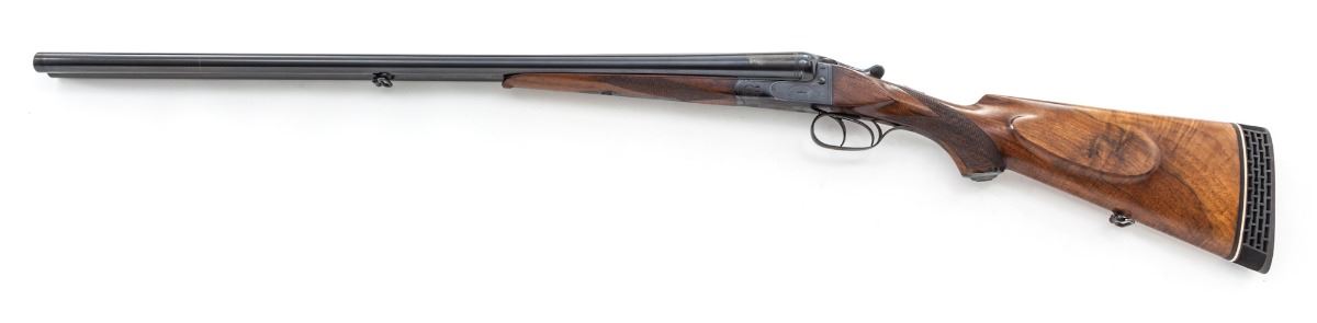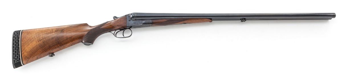 J. P. Sauer & Sohn, Suhl, Side-by-Side Boxlock Shotgun, #303789, 12 ga., 2-3/4'' chs., blue finish, 28-1/4'' barrels with 7/16'' matted concave rib and front silver bead, Full/Mod. chokes, double underlugs and single crossbolt, with extractor; barrels have ''(eagle)/M'' proofs, barrel flats have ''(eagle)/N'' nitro-proofs with 1941 date code; frame has light border engraving, double triggers and automatic top-tang sliding safety; pistol-grip stock and splinter forend have a light varnish with a small hunting cheekpiece. Length of pull is 15-1/4'' over a 1-1/4'' black Pachmayr ventilated recoil pad, sling swivels are 3/4'', weight is 6-3/4 lbs. Current condition is out-of-proof with original 2-1/2'' chambers lengthened to 2-3/4''. Action is tight with bright bores and storage debris; barrels and frame have a thin reblue over earlier pitting and corrosion. Stock inletting is rough along the upper tang with a small beginning split. Est.: $800-$1,200. (C&R)