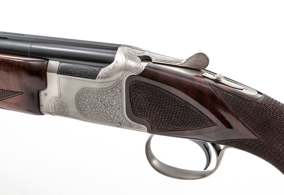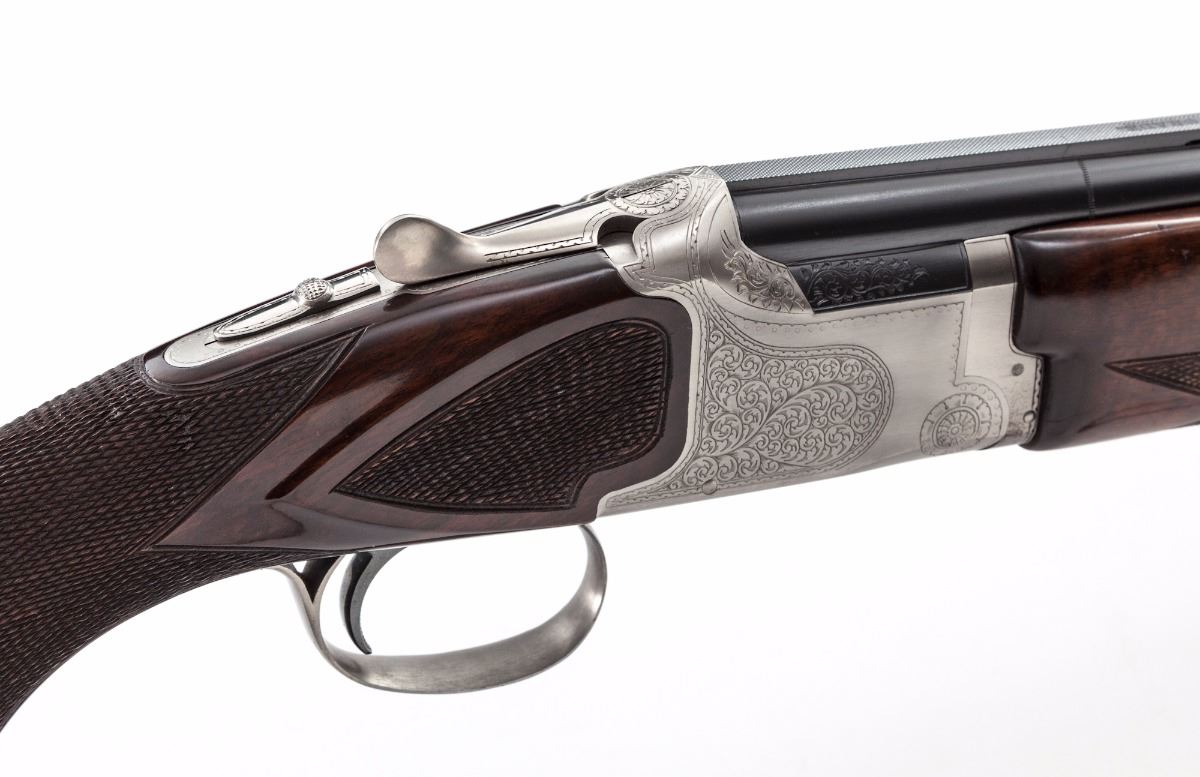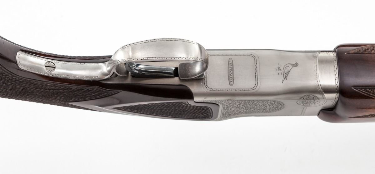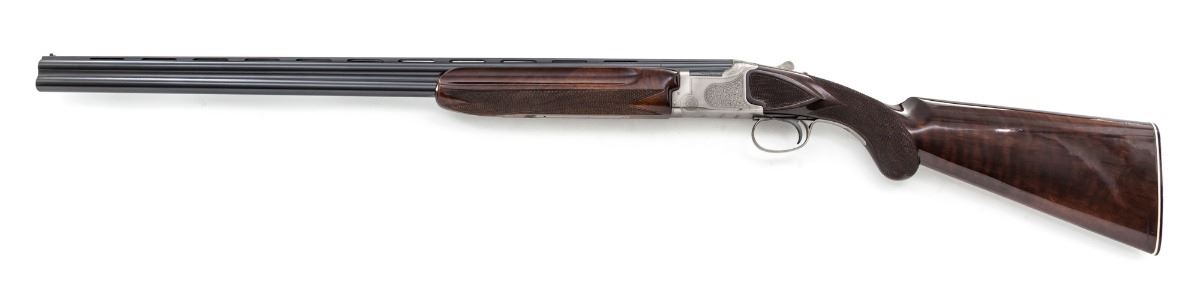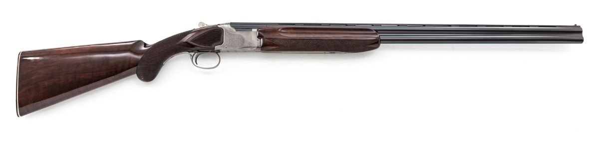 Winchester Model 101 ''Pigeon Grade'' Over/Under Shotgun, #PK262375, 20 ga., 3'' chs., 28'' barrels with matted 5/16'' ventilated rib and Bradley style front white bead; Full/Mod. chokes, with ejectors. The silver nitride frame has light scroll engraving with border highlights extending along the lower tang and barrel flanges, with a single selective inertia trigger with a combination automatic top-tang sliding safety and barrel selector. Round knob stock and fingergroove forend are darkly streaked walnut with a gloss finish and 20 line-per-inch hand checkering including the side panels. Length of pull is 14'' to a ribbed black plastic buttplate, weight is 6-3/8 lbs. Mfg'd ca. 1980. Overall condition is 99%, appearing to have been fired only a few times. Stock has small handling scuffs and fine scratches. Est.: $1,600-$2,200. (Modern)