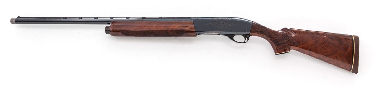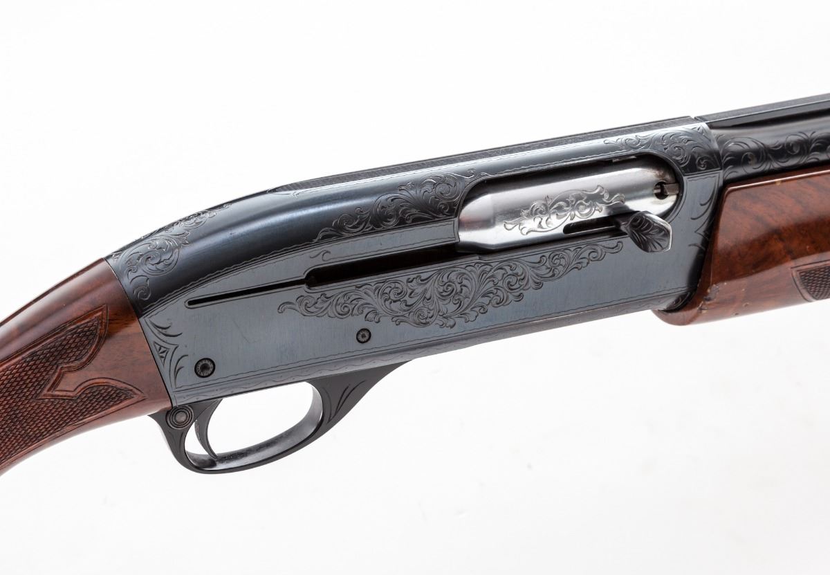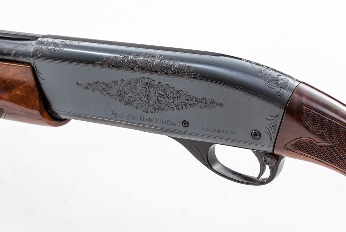 Remington D Grade Model 1100 Semi-Automatic Shotgun, #L-648821M, 12 ga. for 2-3/4'' shells, 26'' vent rib barrel marked ''Target Contour'' with twin beads and extended Briley type choke tube; hand-cut D Grade engraving, as well as make, model and serial number; fancy checkered walnut stock and forend. Condition is near excellent with light general micro-scratching to flat portions of frame and some thinning at balance point. Stock with light marks from handling and range use. Action is good, bore is bright. Length of pull to end of pad: 14''. Est.: $1,500-$2,000. (Modern)