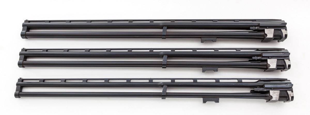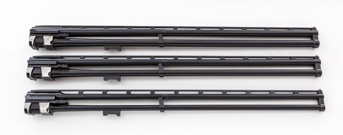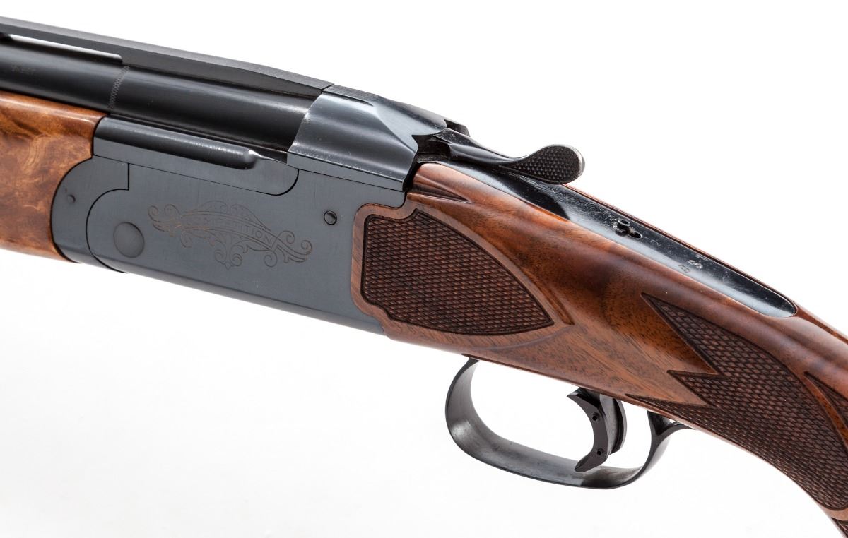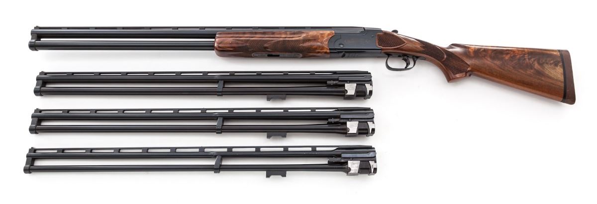 Remington Model 3200 Four Gauge Competition Skeet Over/Under Shotgun Set, #OU.46896, 12, 20 & 28 gauge with 2-3/4'' chambers, .410 bore with 2-1/2'' chambers, bright blue finish, 27-1/2'' barrels with skeet chokes, Bradley style front white beads with steel middle beads, matted 5/16'' ventilated ribs, ejectors and removable trigger shoe; combination top-tang safety and barrel selector lever have been removed; frame is engraved ''COMPETITION'' in a scroll bordered banner with gold fill. The pistol-grip target stock and forend are semi-deluxe gloss-finished walnut with 20 line-per-inch checkering. Length of pull is 14-1/8'' over a 3/4'' brown Remington recoil pad, drop at comb is 1-1/2'', drop at heel is 2'', weight with 12 gauge barrels is 8-3/4 lbs. Mfg'd ca. 1981. The set is housed in a gold pile lined leatherette Gun-Ho partitioned case with a combination latch; 1977 dated paperwork including instructions, information cards and safety lever wrench. Condition is very good with a tight action and strong ejectors. Action face shows moderate use, mostly from the 20 gauge lower barrel; missing safety lever assembly is locked on the lower barrel. Blue finish is approx. 98% on the frame and 12, 28 and .410 barrels with light oxidation; assembly marks and small scattered nicks on the top ribs; the 20 gauge barrels have 95% blue drifting slightly to brown. Bores and muzzles have powder residue and light oxidation; gold fill in the frame engraving is fading. Stock has minor small handling marks. Case has a few scuffs and powder marks. (Provenance: Robert Peterson collection.) Est.: $3,000-$4,500. (Modern)