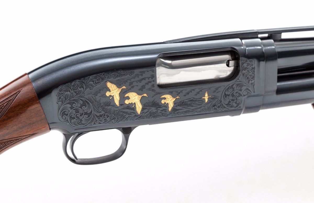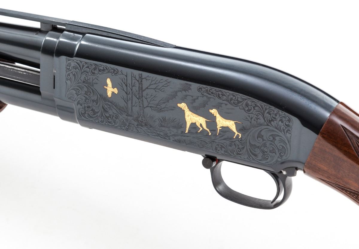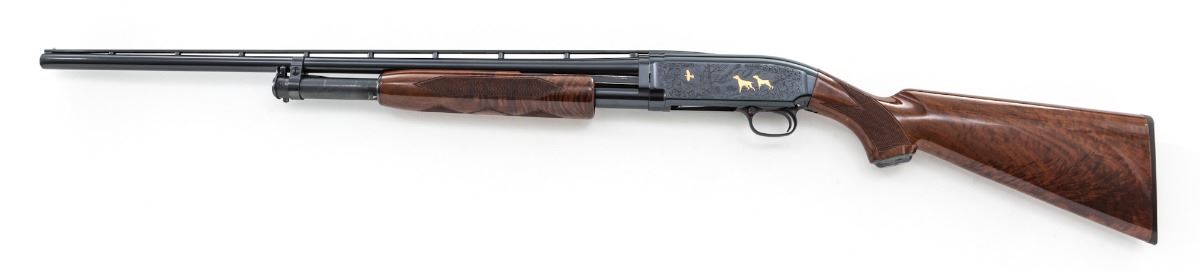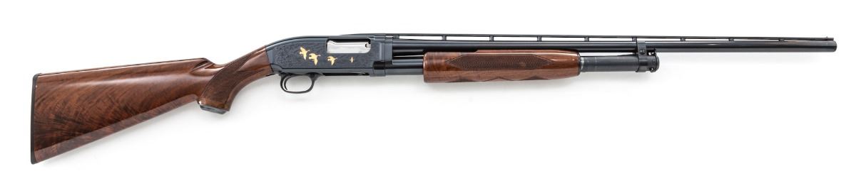 Browning Model 12 Limited Edition Grade V Slide Action Shotgun, #02912NM972, 28 ga., 2-3/4'' chs., blue finish, 26'' barrel with matted 1/4'' ventilated rib and silver front bead, Modified choke and triggerguard-mounted push-button safety; receiver has etched game scenes with scroll borders featuring applied gold grouse and dogs in a woodland on the left side and applied gold ducks in flight over a marsh on the right side. Pistol-grip stock and handle are figured walnut with vivid flame patterns finished in a high-gloss urethane; checkering is 20 lines per inch, with a steel grip cap. Length of pull is 14'' to a black plastic Browning buttplate, weight is 7-3/8 lbs. Mfg'd ca. 1990. No box. Overall condition is near excellent retaining 98% blue, showing light use with cycling and assembly marks. Barrel has minor fouling residue. Stock has a few handling marks and scuffs. Est.: $1,200-1,600. (Modern)