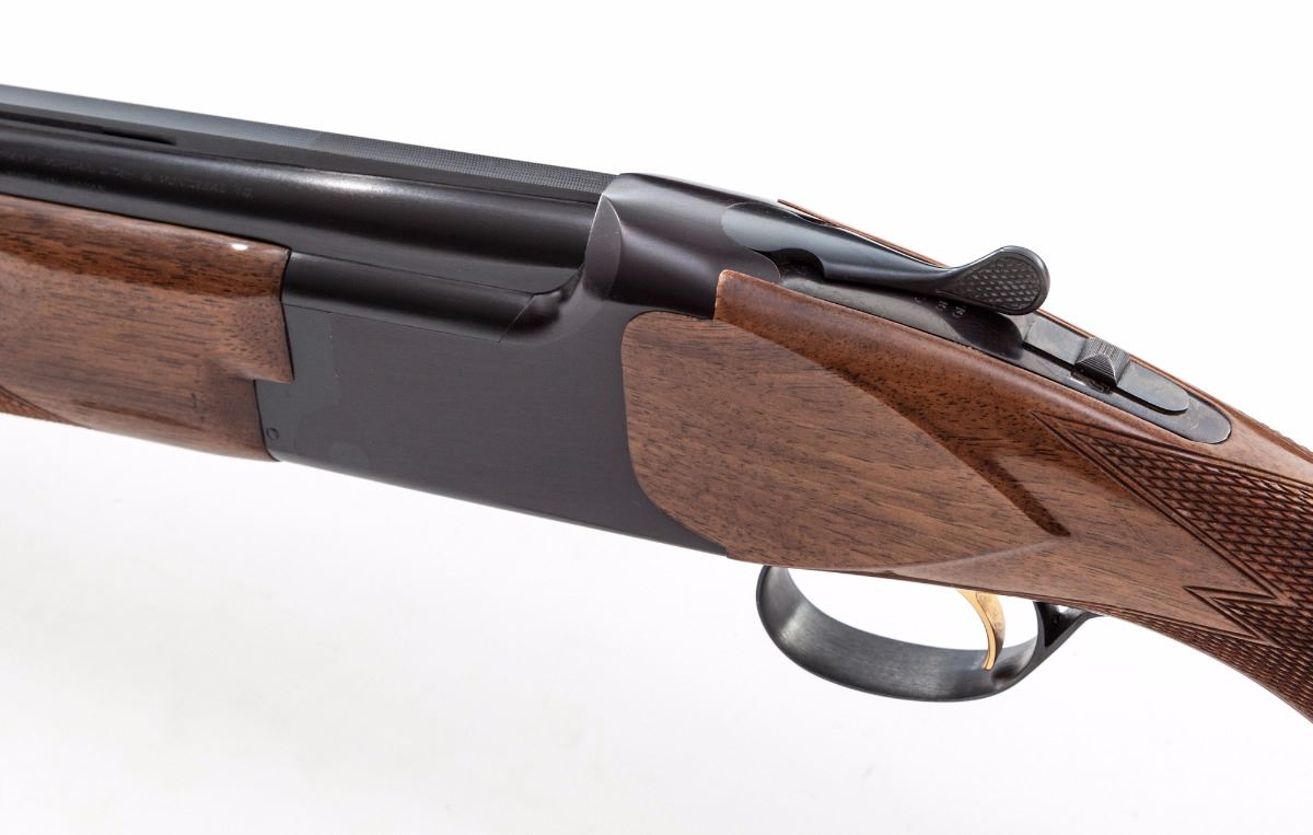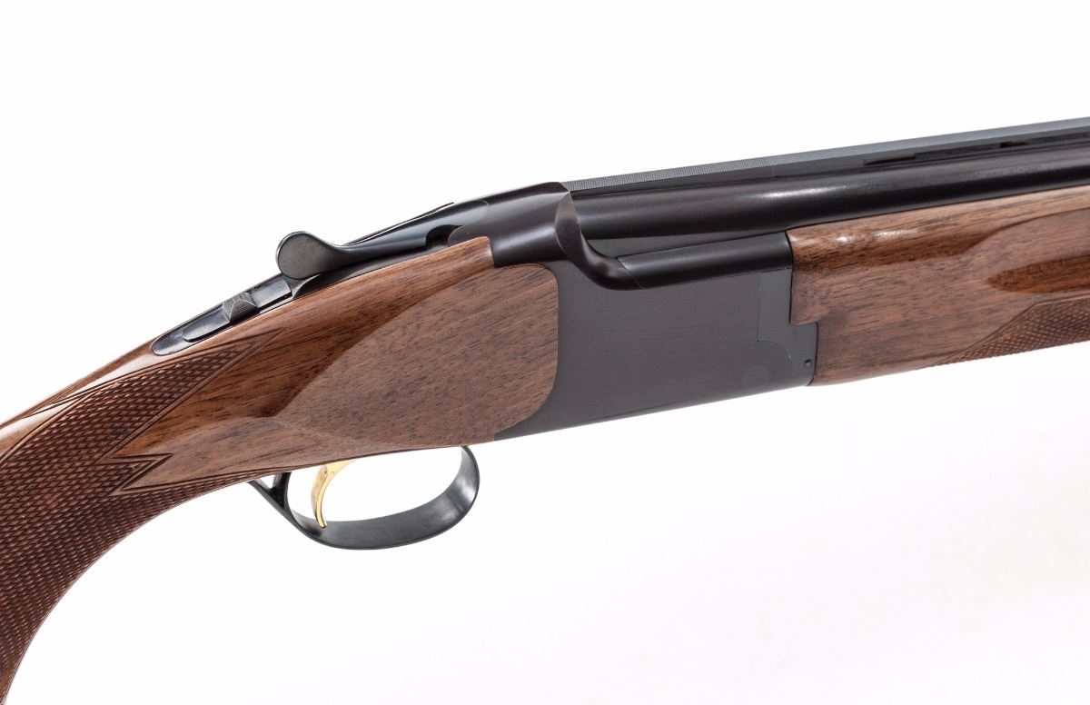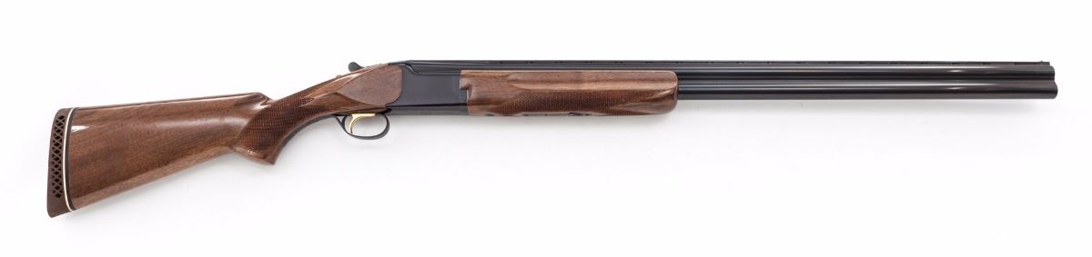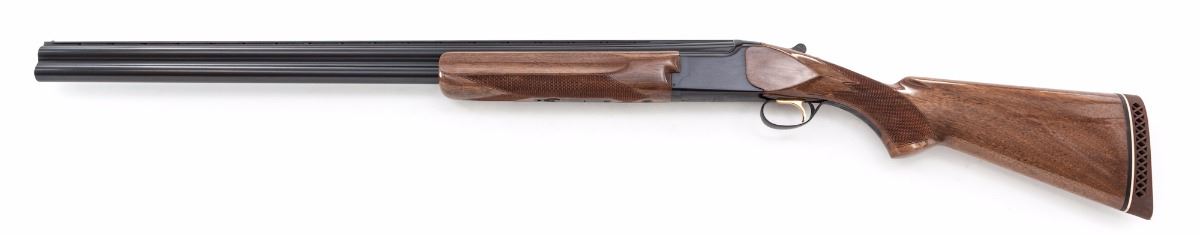 Early Browning Citori Hunting Grade I Over/Under Shotgun, #13113RTJ53, 12 ga., 3'' chs., blue finish, 30'' barrels with matted 5/16'' ventilated rib and front steel bead, Full and Modified chokes, with ejectors; plain receiver with gold-plated inertia trigger and combination top-tang manual safety and barrel selector. Pistol-grip walnut stock and fingergroove forend have a high-gloss finish with 16 line-per-inch checkering. Length of pull is 14-1/8'' over a brown 1'' Browning recoil pad; weight is 7-3/4 lbs. Mfg'd ca. 1976. Condition is near excellent showing very little use, with a tight action, bright bores and light fouling residue around the muzzles. Frame blue is developing a slight plum cast; barrels and stock have a few handling and storage marks. Est.: $600-$800. (Modern)