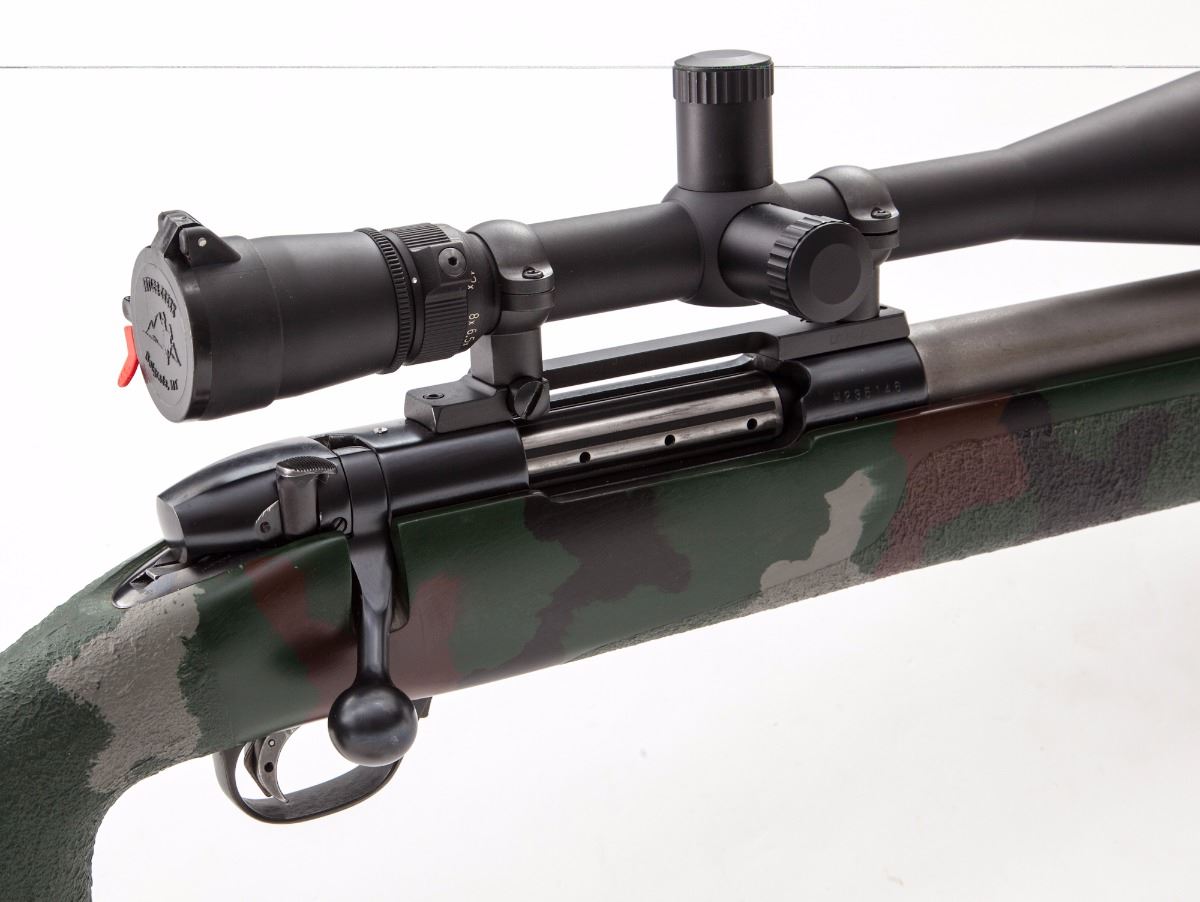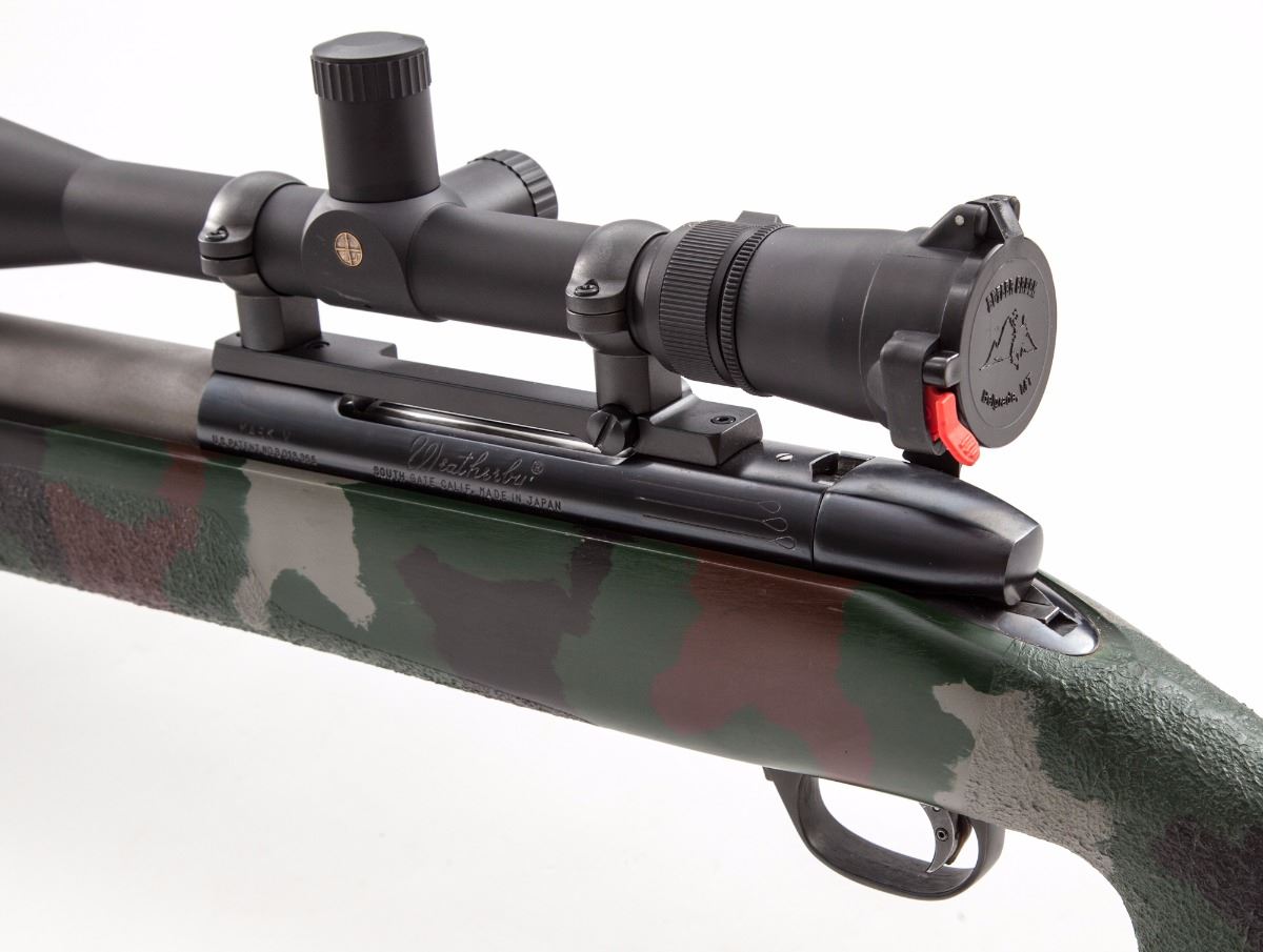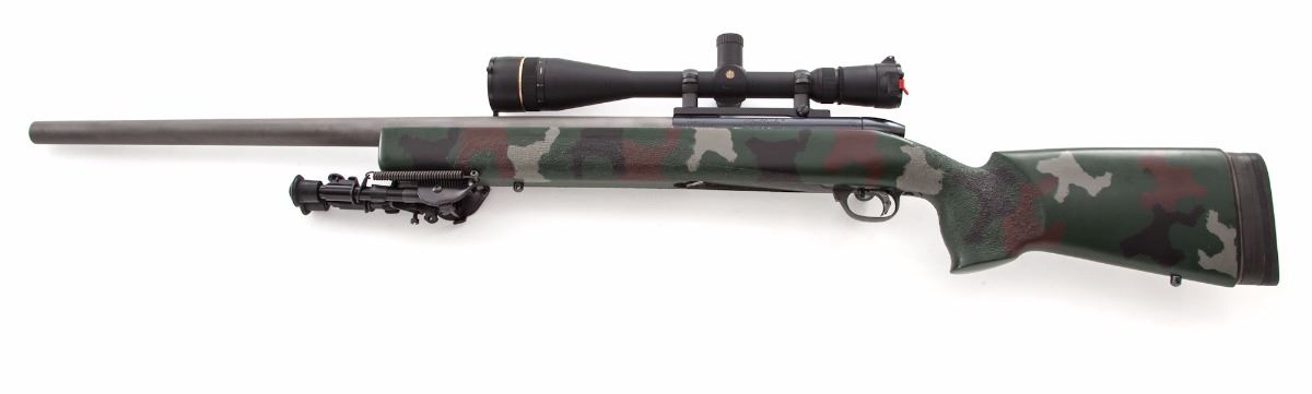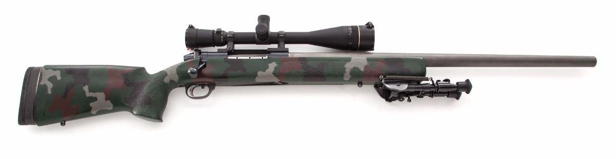 Custom Heavy Barrel Weatherby MK V Bolt Action Rifle, #H235146, .300 Wea. mag. cal., 26'' matte light gray heavy unmarked barrel, blue receiver, pistol-grip composite camouflage stock (appears to be a McMillan stock), Pachmayr Decelerator recoil pad with four spacers, textured forend and pistol grip, adjustable trigger, two sling swivel studs, and a Harris Ultra-Light bipod. Topped with a Leupold Vari-X III 6.5x20 E.F.R. scope on Leupold mount and rings. Made in Japan. Condition is near excellent. Matte barrel with light scuffs, mainly to top edge. Stock with general light marks from handling. Action is crisp, bore is bright, scope optics are clear. Rifle with scope weighs just under 15 lbs. Est.: $1,000-$1,500. (Modern)