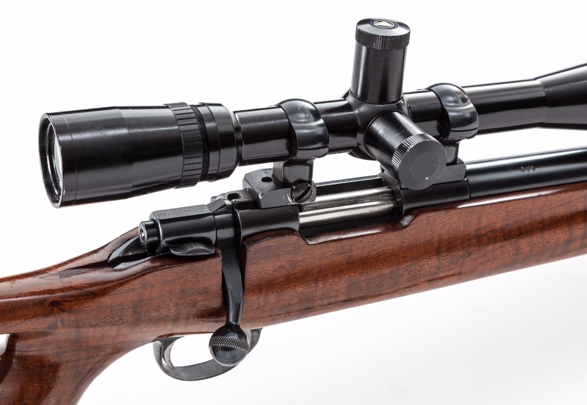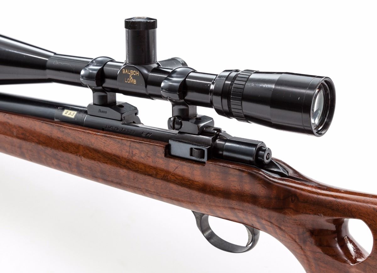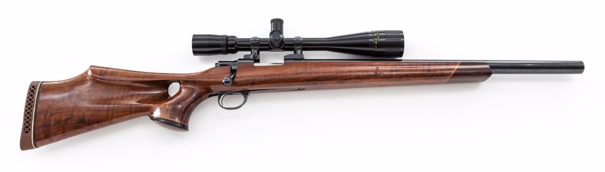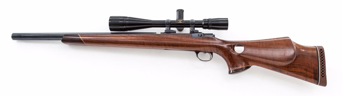 Custom Sako Single Shot Bolt Action Rifle on L461 Action, #72533, .223 cal., 21'' medium-weight barrel, blue finish, thumbhole cheekpiece walnut stock with double maple spacers, rosewood forend and pistol-grip cap, with brown Whiteline rubber butt pad. Topped with a Bausch & Lomb 36x40 high-turret scope on Burris rings and mounts. Condition is excellent as modified. Metal surfaces retain approx. 94% blue. Stock with light general scratches overall. Action is good, bore is bright, scope optics are clear. Est.: $500-$750. (Modern)