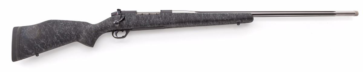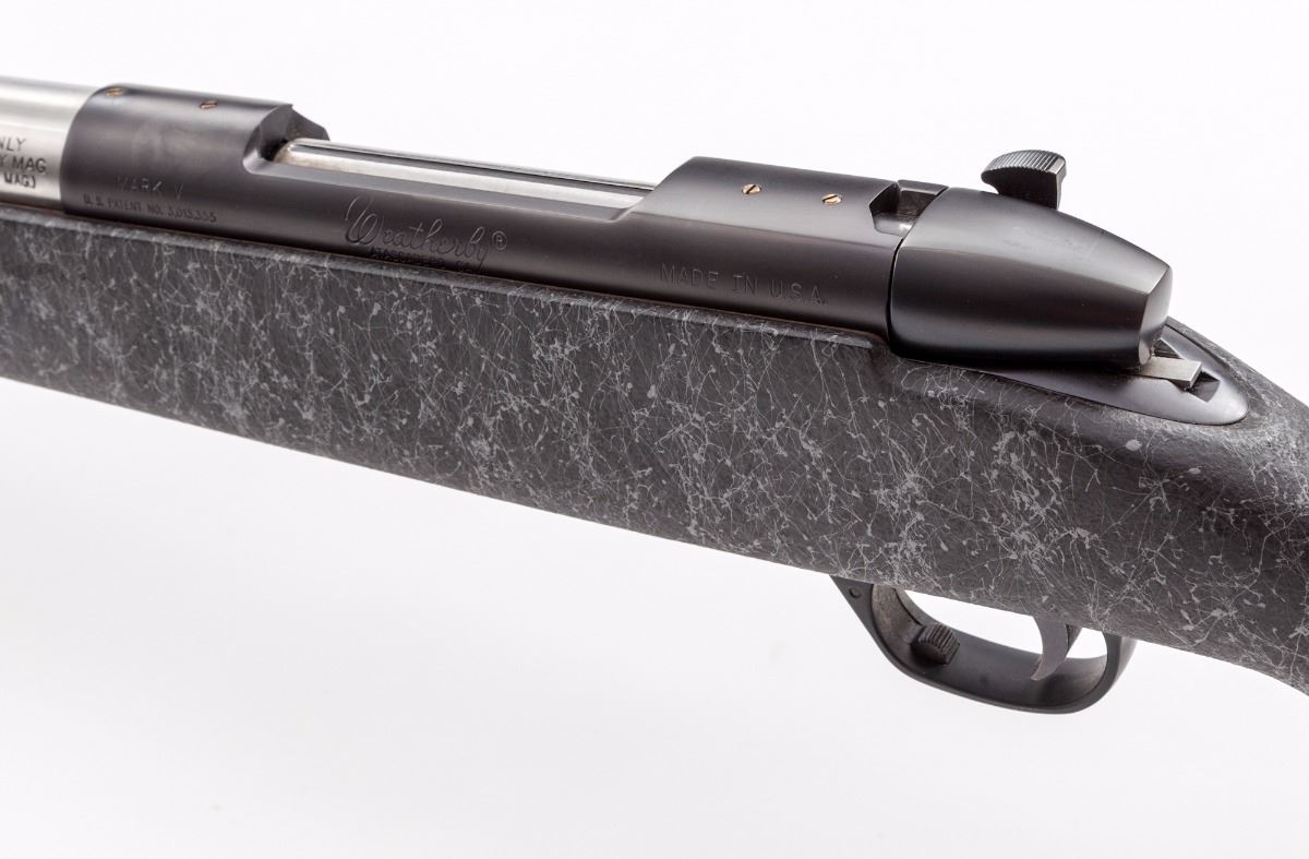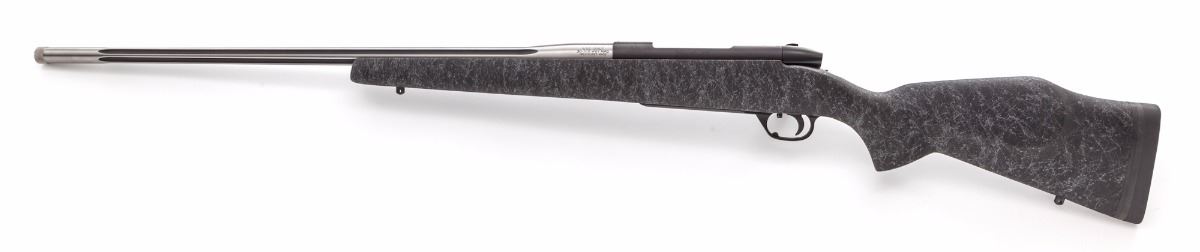 Weatherby MK V Bolt Action Rifle, #SB020323, .30-378 Wea. mag. cal., 26'' fluted stainless steel barrel, satin finished blue receiver, synthetic black Monte Carlo stock with gray accents, Kickeez black rubber recoil pad, adjustable trigger, with sling swivel studs. Made in the USA. Condition is excellent, appearing near new, showing just light marks from handling. Action is crisp, bore is excellent with sharp rifling. Est.: $1,000-$1,500. (Modern)