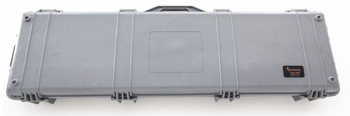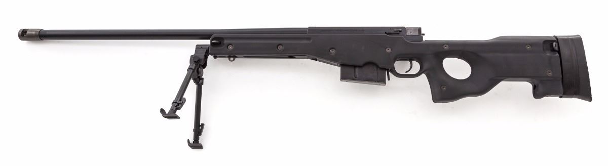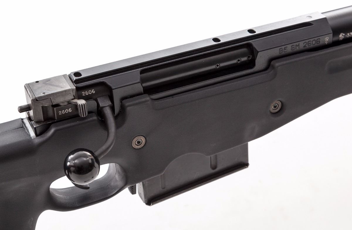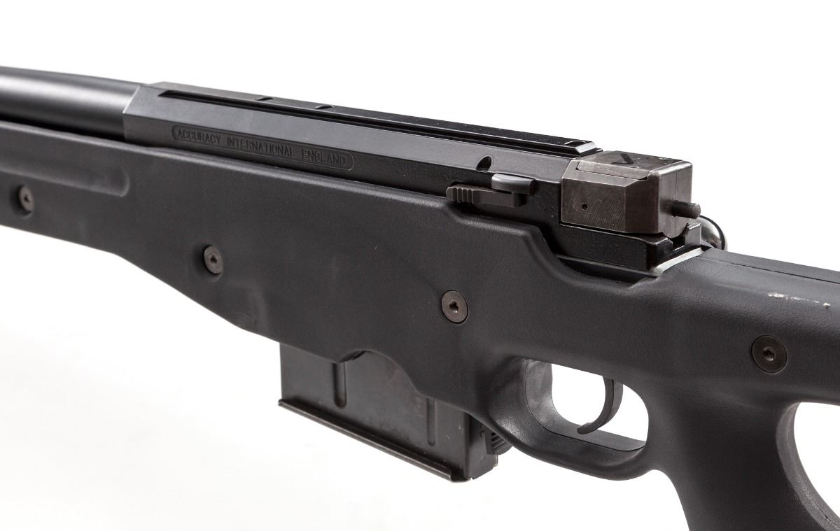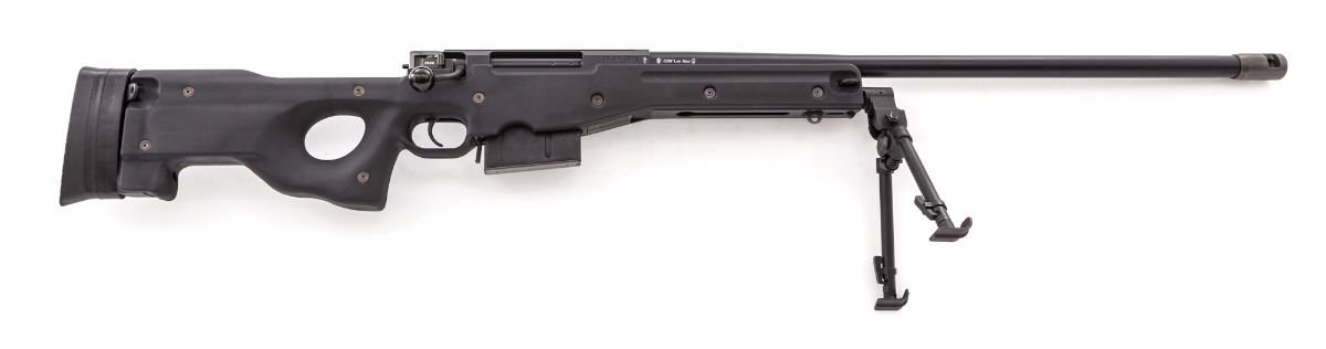 Accuracy International Model Super Magnum Bolt Action Sniper Rifle, #95SM2606, .338 Lapua cal., 27'' barrel, black finish, black synthetic thumb-hole stock, factory black rubber recoil pad, muzzlebrake, with bipod and one 10-round magazine. Right side of barrel is marked ''6324''; top of barrel marked ''Imported by Gunsite, Paulden, AZ''. In Browning Travel Vault Model 5115 light gray case, with unmarked scope base not attached to the rifle and owner's manual. Condition is near excellent. Barrel and receiver retain approx. 98% black finish. Right side of receiver with a few scattered moderate scratches. Bolt shroud appears to have been chemically cleaned and retains little original finish. Stock with normal light marks from handling. Action and bore are like new. Est.: $3,000-$5,000. (Modern)