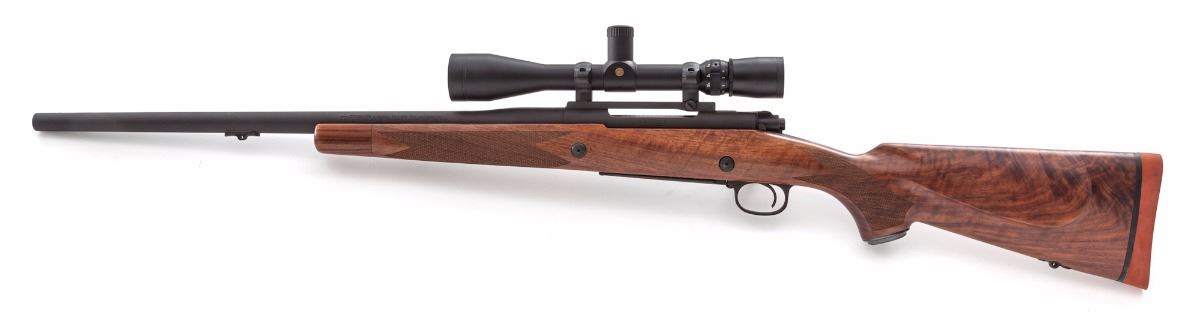 Winchester Model 70 Super Express Bolt Action Rifle, #G25502, .458 Win. mag. cal., 22'' barrel, matte gray finish, checkered pistol-grip walnut stock with cheekpiece, black pommel cap, floral engraved crossbolt, factory red rubber Winchester recoil pad with black spacer. Factory sling swivels are mounted to the underside of barrel and inlaid into bottom edge of stock. Floorplate is marked ''Super Express''. Topped with a Leupold Vari-X III 3.5x10 scope. Condition is excellent, appearing near new, with just a few scattered light marks from handling. Action is crisp, bore is bright, scope optics are clear. Est.: $1,000-$1,500. (Modern)