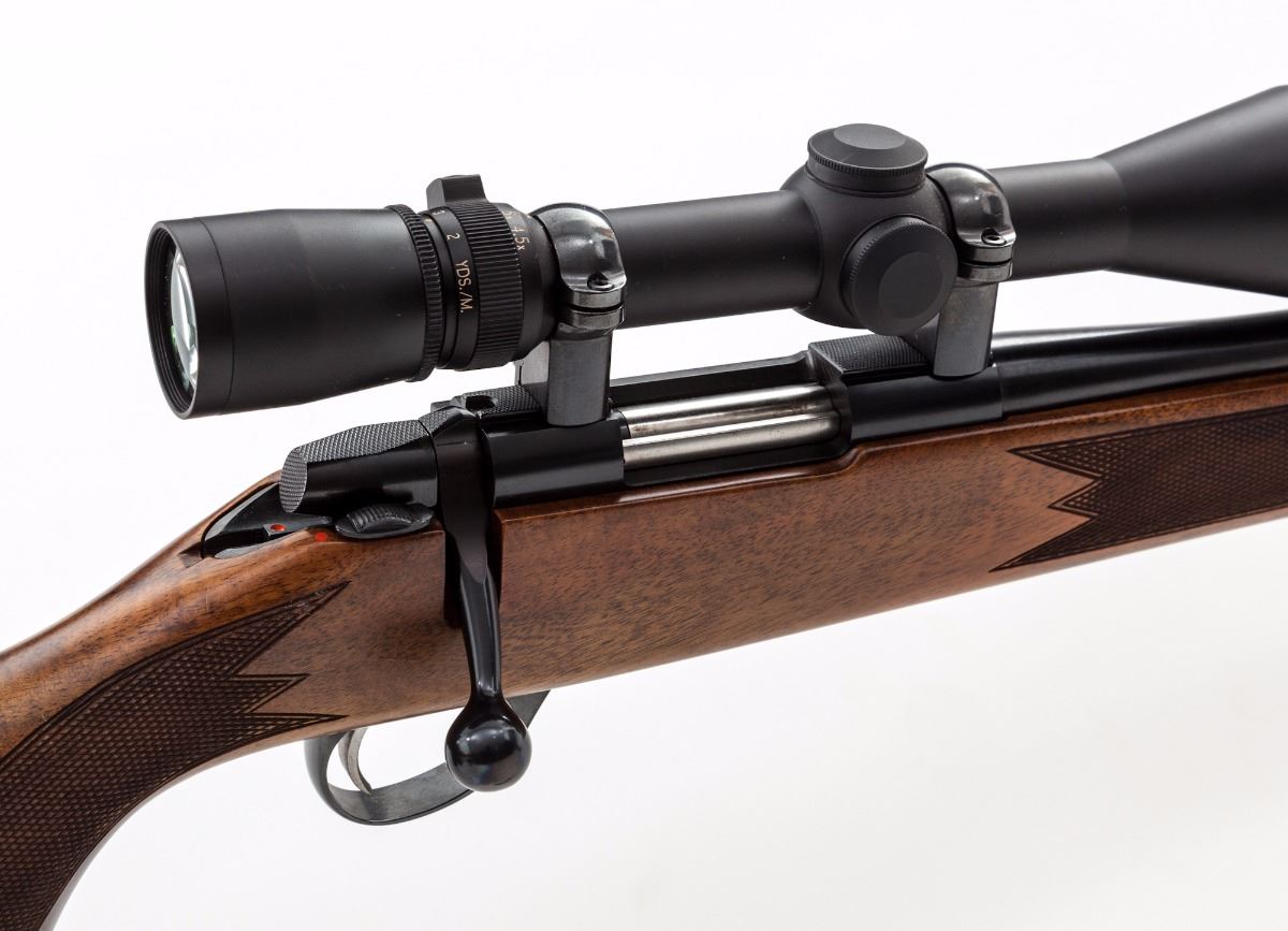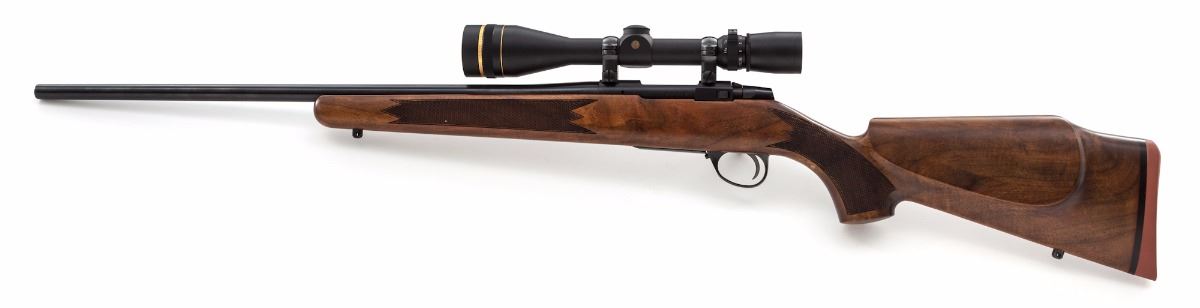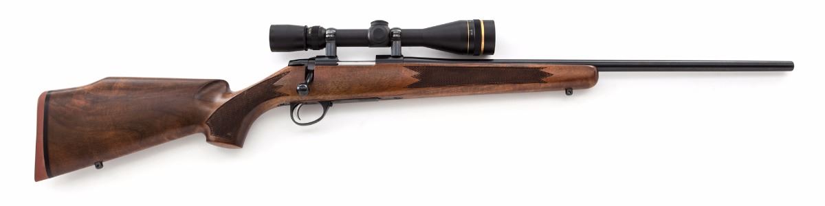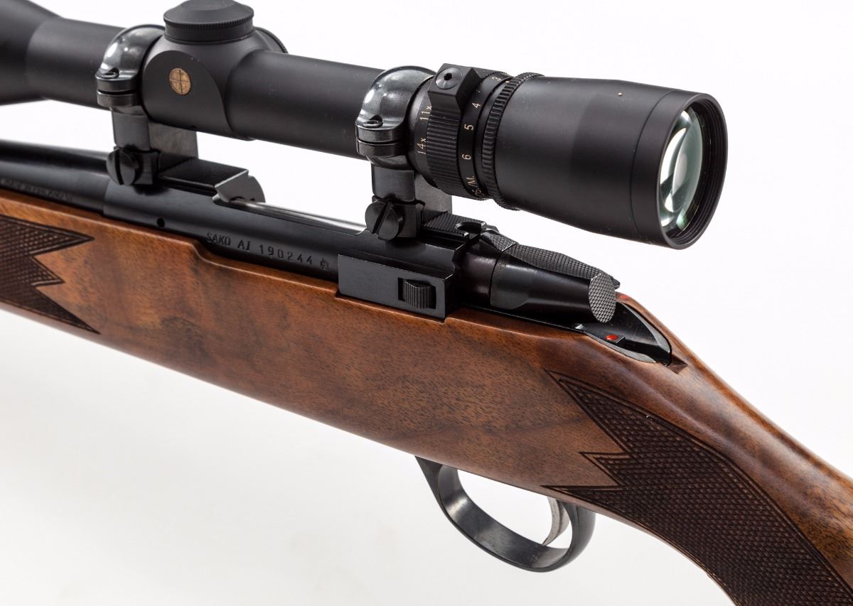 Sako Bolt Action Rifle with AI Short Action, #190244, .17 Rem. cal., 22-1/2'' barrel marked ''Made in Finland'', dark blue finish, checkered palm swell pistol-grip walnut stock with cheekpiece, factory red hard rubber Sako recoil pad, with sling swivel studs and serrated bright trigger. Topped with a Leupold Vari-X III 4.5x14 scope. Imported by Stoeger Inc., New Jersey, and so marked on bottom of barrel. With the exception of one noticeable impression to the pistol grip and mild flattening to the checkering on the right side of stock, this rifle is in excellent condition. Metal surfaces retain approx. 99% blue and show only a few minor marks from handling. Action and bore are excellent, scope optics are bright and clear. Est.: $700-$900. (Modern)