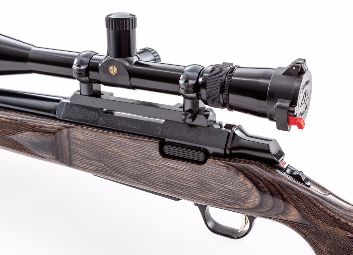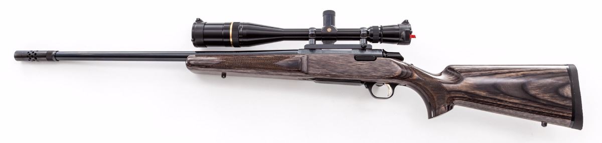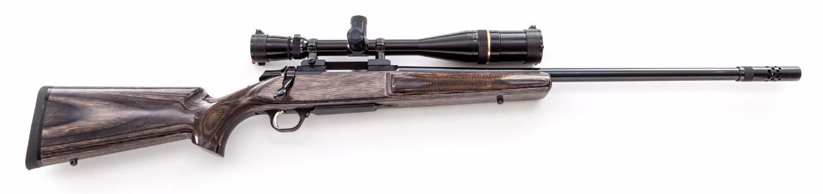 Browning A-Bolt Medallion with BOSS Bolt Action Rifle, #52164NW817, .22-250 cal., 24'' barrel which includes the attached BOSS system, dark blue finish with lightly engraved receiver and floorplate, checkered pistol-grip high-gloss black laminated stock, factory rubber Browning recoil pad, gold-plated trigger, with sling swivel studs. Topped with a Leupold Vari-X III 6.5x20 E.F.R. scope. Condition is excellent retaining approx. 99% blue with some scattered light marks from handling. Stock with a few minor impressions near forend and pistol-grip checkering. Action and bore are excellent, scope optics are bright and clear. Est.: $800-$1,200. (Modern)